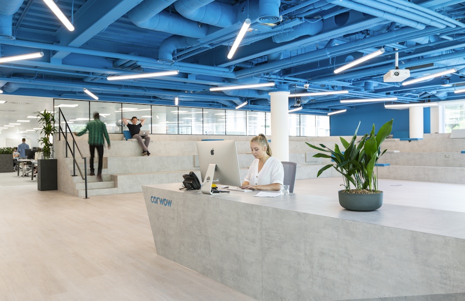 The ‘Carwow blue’ ceiling brings the WOWfactor, where all exposed ductwork has been painted in the same colour. It’s a striking talking point in the front of house area –a large space that is not only a reception but also a company meeting room, collaboration zone and event space.