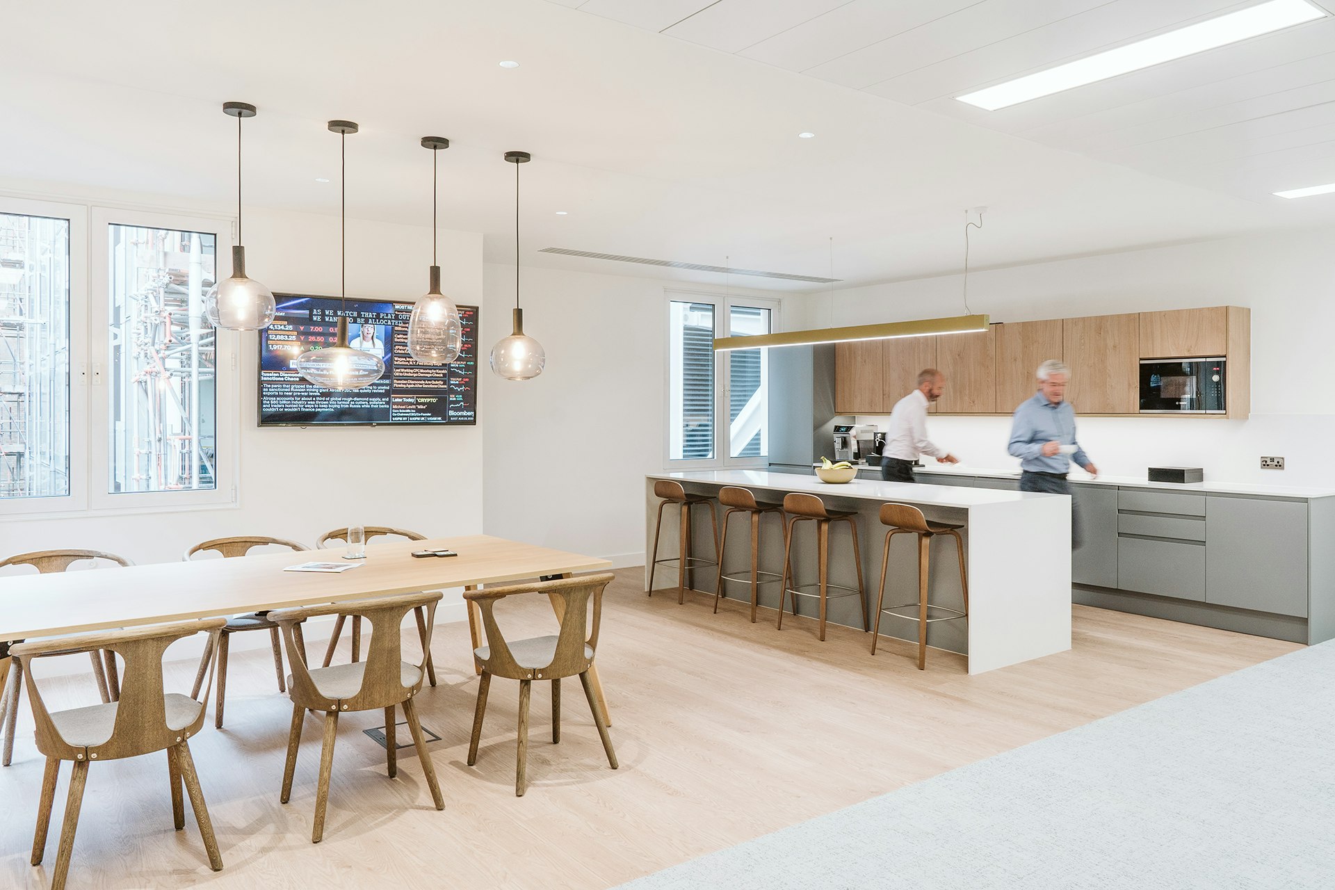 The break out area sits at the heart of the space. With natural wooden furniture, a modern and neutral kitchen and contemporary lighting, this space achieves the high quality, timeless style that the client desired. Its open plan design means the space can be used by the whole team to meet, collaborate, and grow as a community.