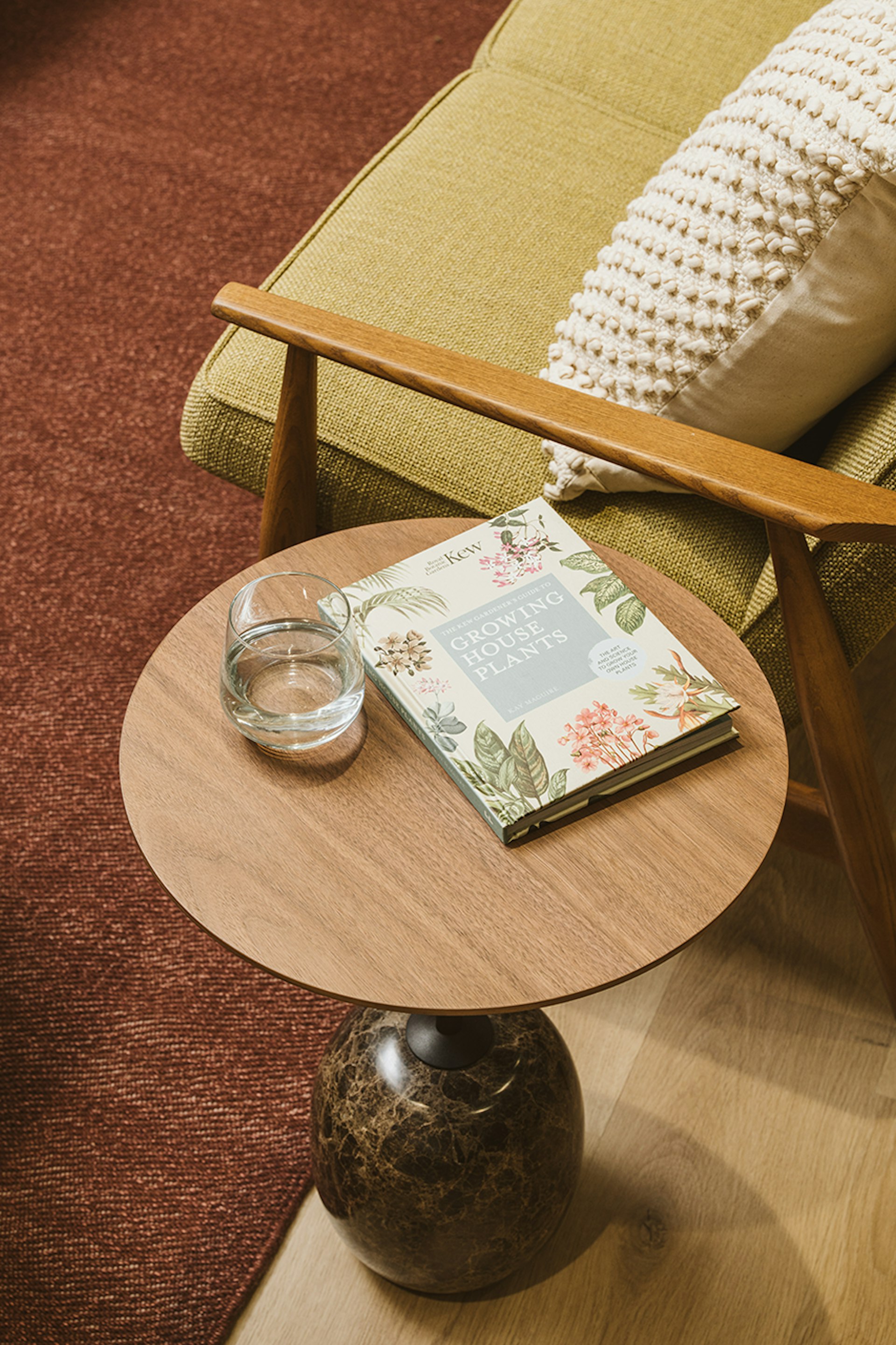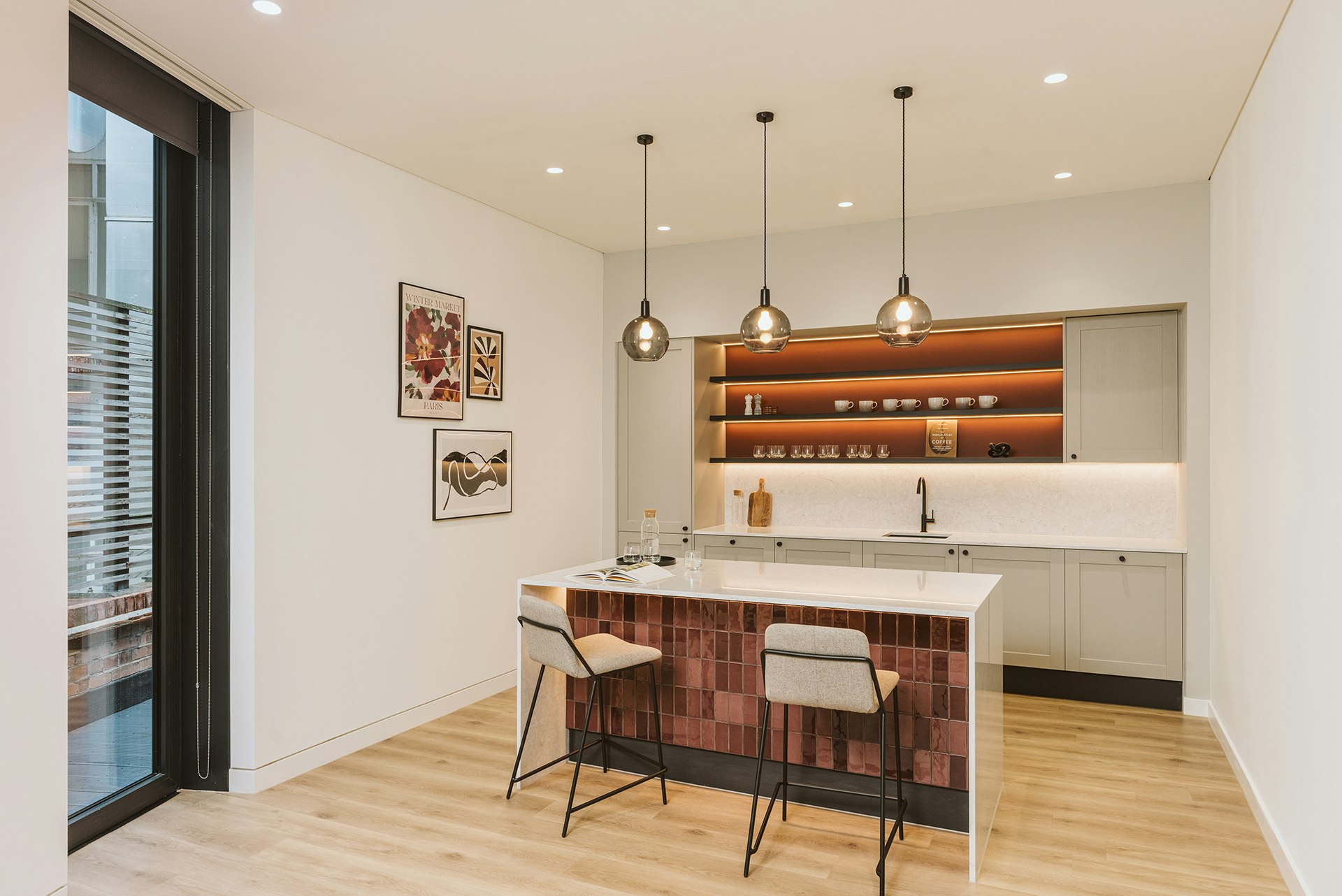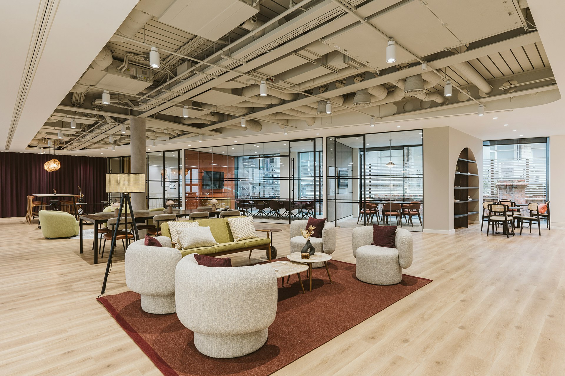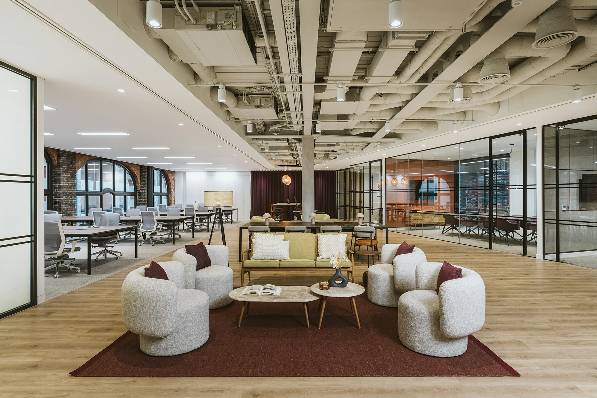 Taking inspiration from the exposed brickwork, we seeded rich maroons, plums and burnt oranges throughout the space. Although bold choices, these vibrant colours fit seamlessly into the scheme, matching the tonal hues of the brickwork. Strategic pops of chartreuse are provided from the furniture pieces, adding a freshness to the space and contrasting against the warmer tones. Alongside this, we selected high contrast colours for the tea point, with white counter tops, black finishes and deep purples and oranges to compliment. With bold choices and eclectic details throughout, this scheme stands out and offers a unique take on CAT A+ - elevating it above its competitors.