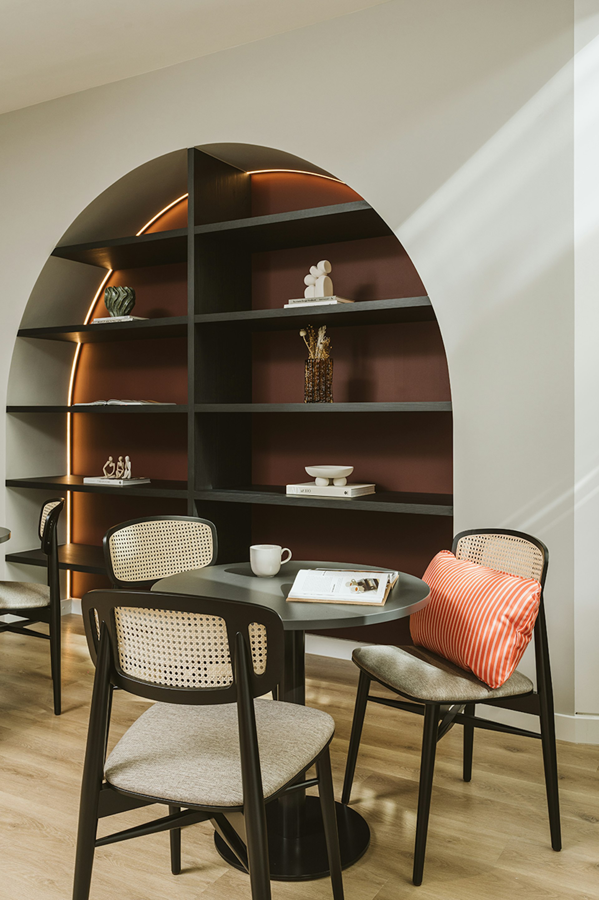 With raw natural materials, exposed brick and a central arched window, Rathbone Place is architecturally striking. When designing this space, we played up to and enhanced these features. The arched windows are a focus feature of this scheme, providing a centrepiece for the space. To carry this motif through to the interiors, we mirrored the bend with an arched shelving unit opposite the tea point. Alongside this, we chose rounded furniture with curved edges to replicate the curved arch, ensuring the design felt holistic and intentional.