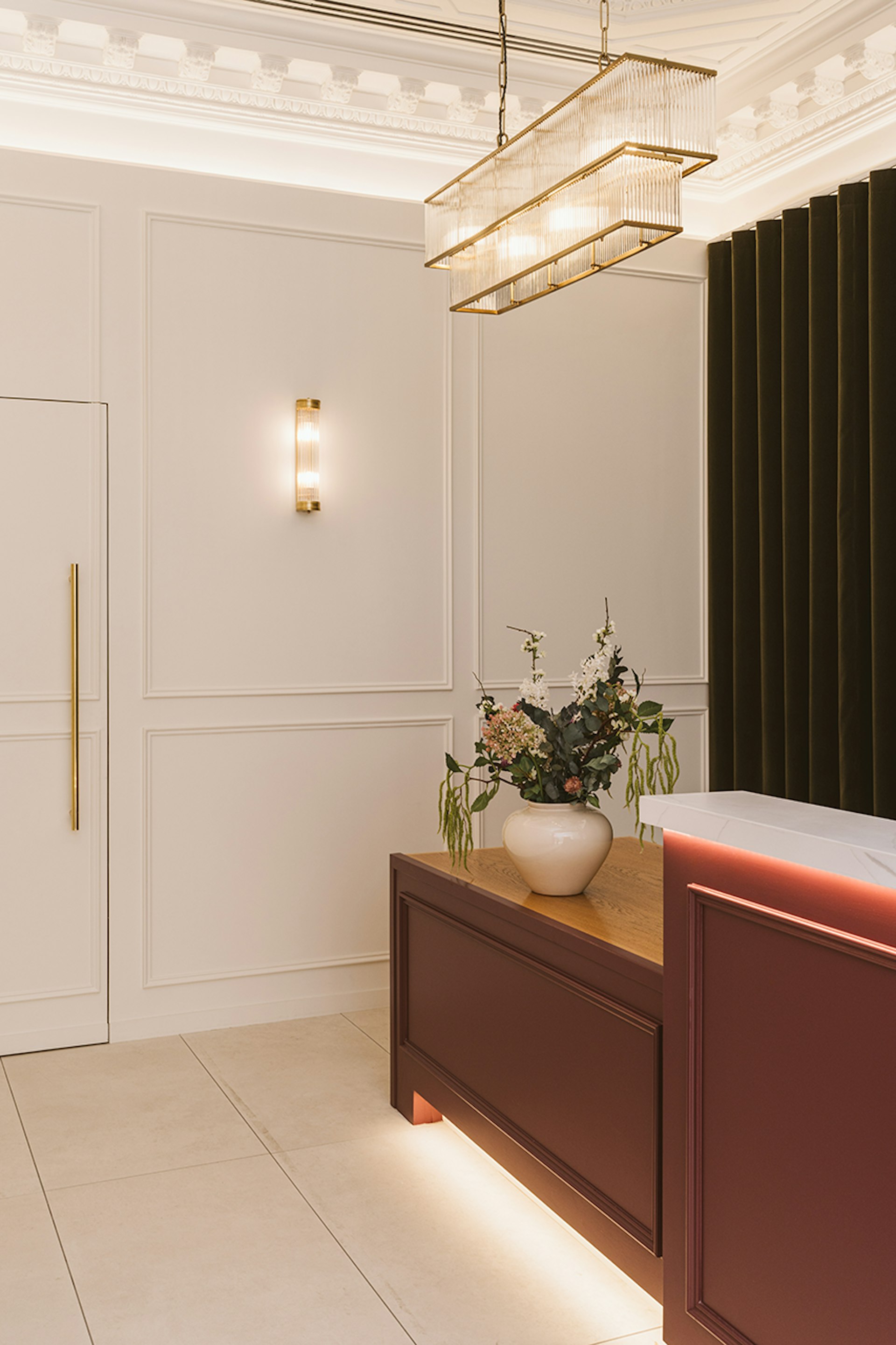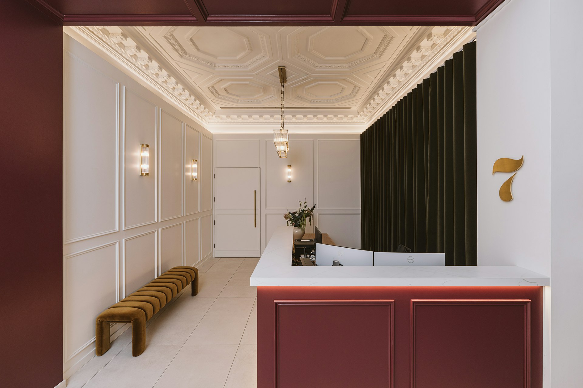 The client tasked us with giving the space a completely new feel, moving away from its more clinical design. Our brief was to create a luxurious and hospitality-esque reception space while leaning into the existing heritage architectural features. The space on the third floor had been vacant for some time so we were also tasked with designing a space that would cater to various prospective tenants, while making it feel bespoke and tailored at the same time.