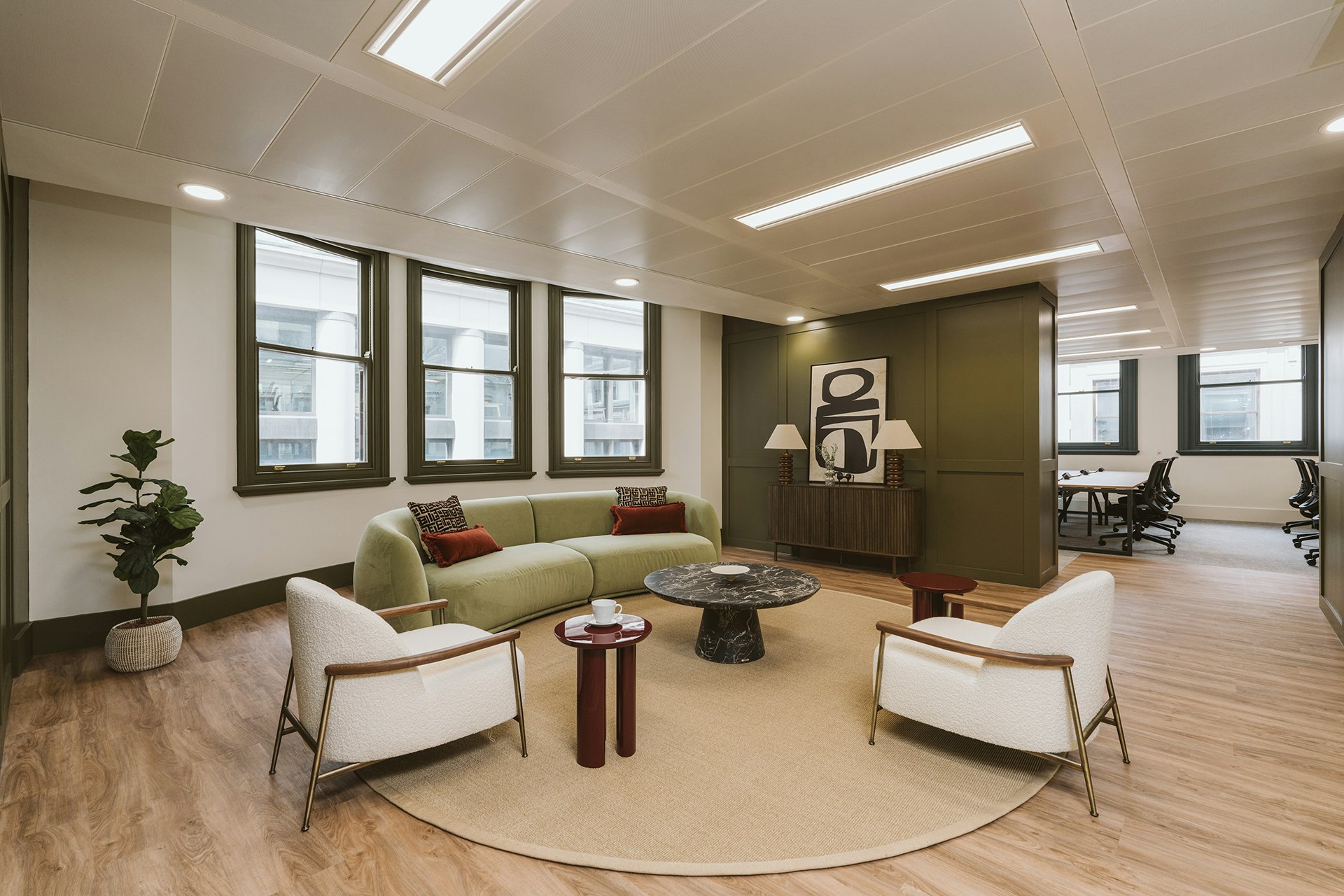 While the goal throughout was to maintain and champion the heritage and the classic architectural elements, we also wanted to ensure we were meeting the brief of injecting luxury into the space. We injected this luxury through our furniture choices, finding pieces that matched the classic elements of the space, while still maintaining a sense of modernity throughout the fit out. This is seen most evidently in the welcome area on the third floor; we chose furnishings that while contemporary in shape and design, are of a more vintage style in colour and material. The dark woods, rich reds and greens, and velour textures, were chosen to offset the more contemporary design of the pieces, leaning into the marriage of the modern and heritage throughout the fit out. These design choices ultimately elevate the premium feeling of entire space, which the team were able to achieve all while keeping costs to a minimum, really making the budget work hard for the pay off.