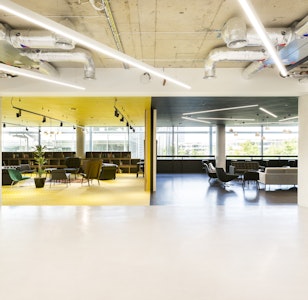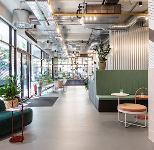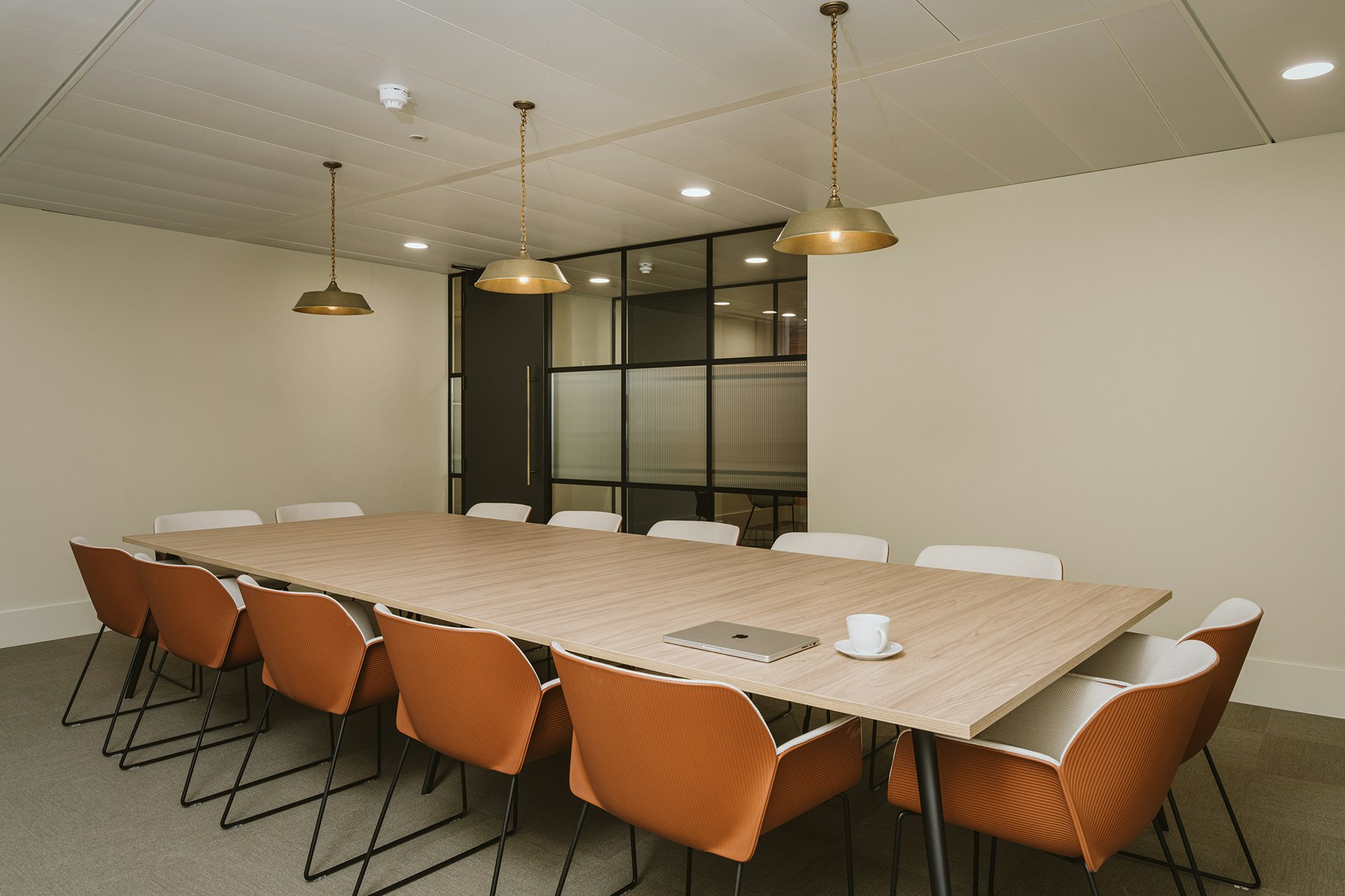 The earthy colour palette and finishes throughout the space, were inspired by the colour of the existing, brown-orange, encaustic tiling in the reception and common parts of the building. The common area on the third floor is where this colour palette is most apparent - with the plush green velvet seating, paired alongside the brown textured tiling, and warm-toned pendant lighting with antique brass accents. The use of both colour and texture here, feels considered and designed, elevating the sense of opulence and luxury that is fitting for the Grade II listed building. This colour story was also brought through to the main office space, where warm orange and mustard yellows were used in the furniture, and antique brass accents were dotted throughout. This continuation of the colour palette inspired by the original heritage elements, was our way of creating a seamless user-experience from entering the building all the way up to the tenant floors.