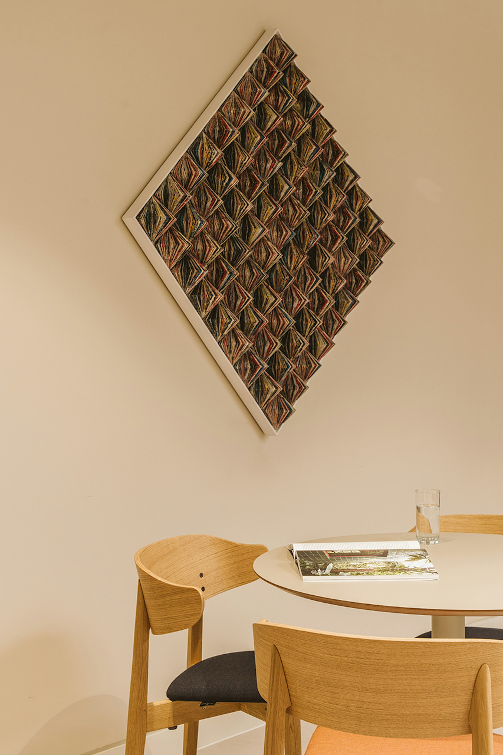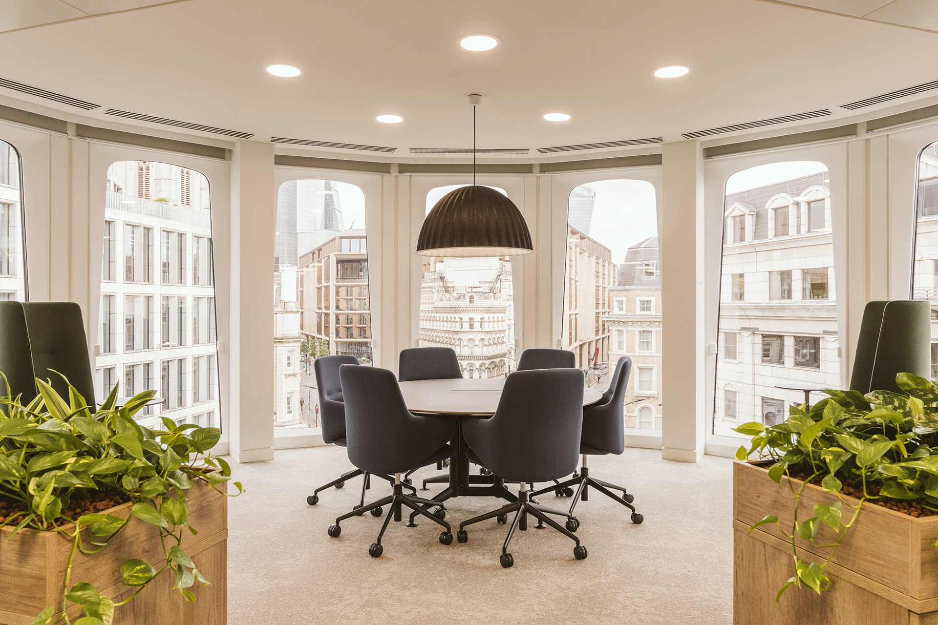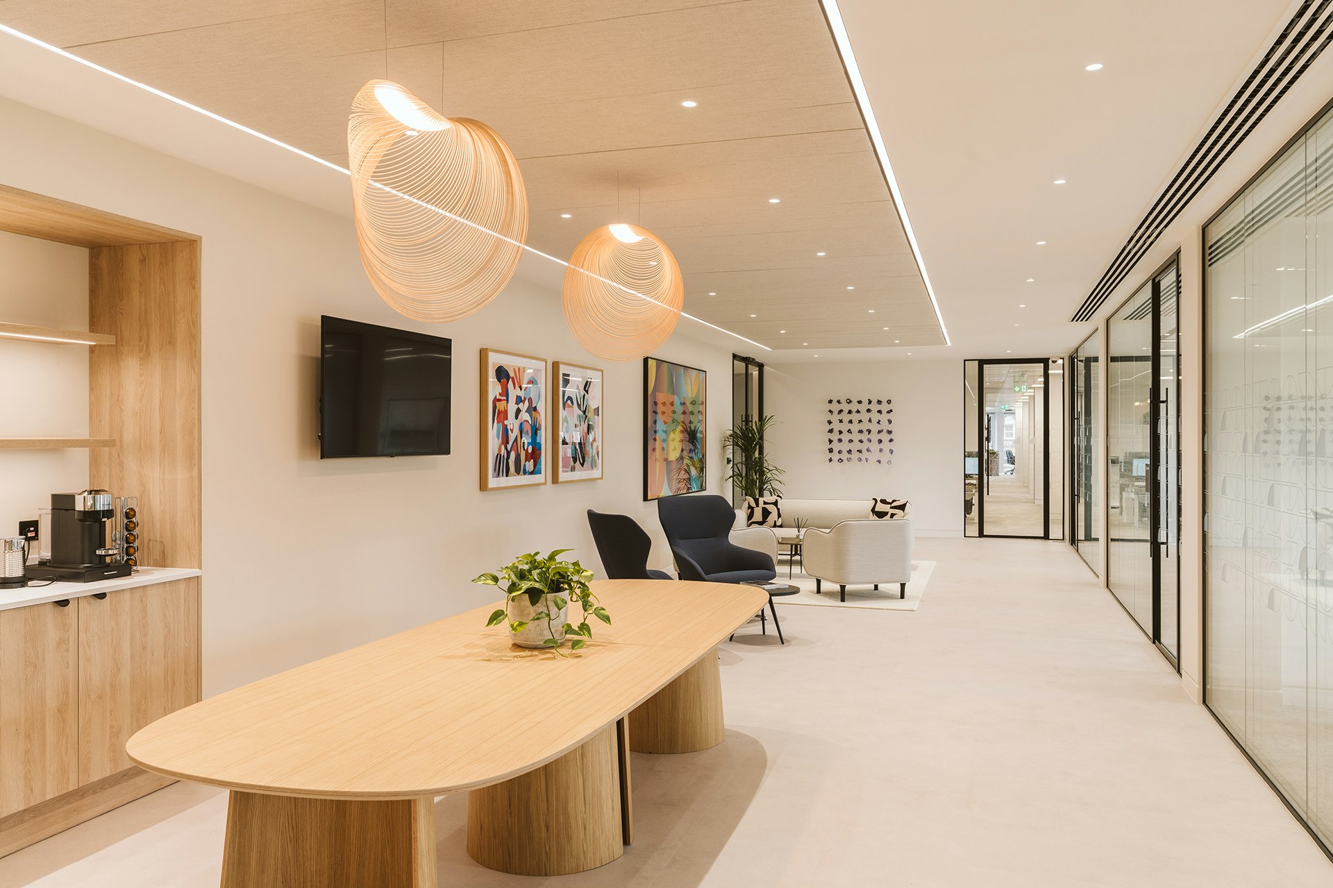 Using their North Carolina headquarters as our inspiration, we designed the London scheme to be bright and minimalistic with light woods and neutral tones throughout, elevated by the natural light that the panoramic windows provide. While this Scandinavian inspired design has taken precedent, pops of colour are introduced to the space through bright abstract art pieces. As well as this, colourful finishes such as orange cushions, chairs and planting throughout, compliment the artworks, making sure that the abstract pieces do not feel out of place amongst the otherwise minimal design.