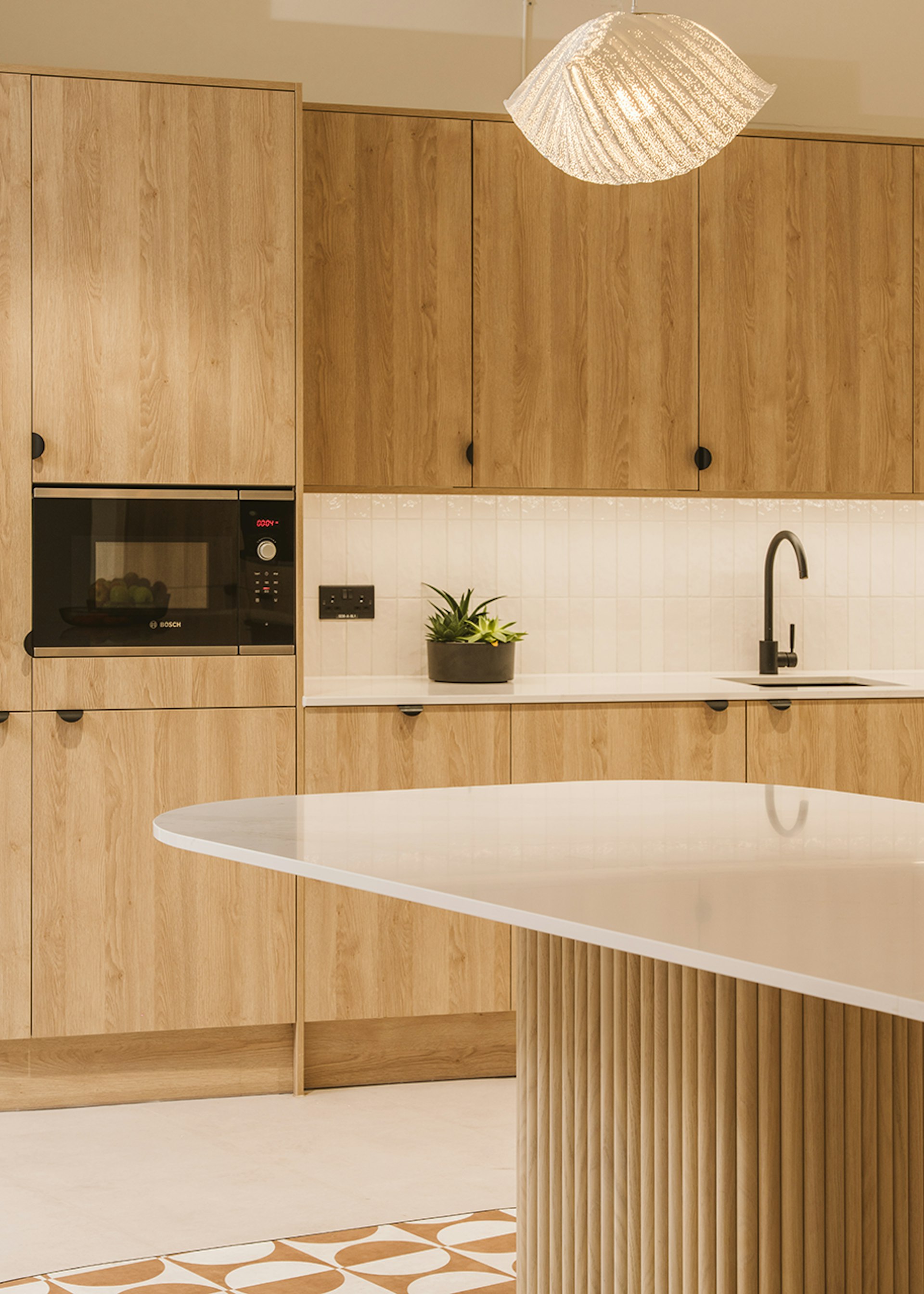 While brand integration was important to Allspring, they wanted to avoid anything that would be too ‘over-the-top’. The branding is seen most clearly in the logo manifestations on the meeting room windows, but also in a more understated way in the Coffee Point in the welcome area where we chose an Ondaretta ‘Ginger’ table as a centre piece. The curves of the table legs are a subtle nod to the curved shapes in Allspring’s logo, further explored in the breakout area where the flooring under the main counter mirror these shapes, and in turn the company logo.