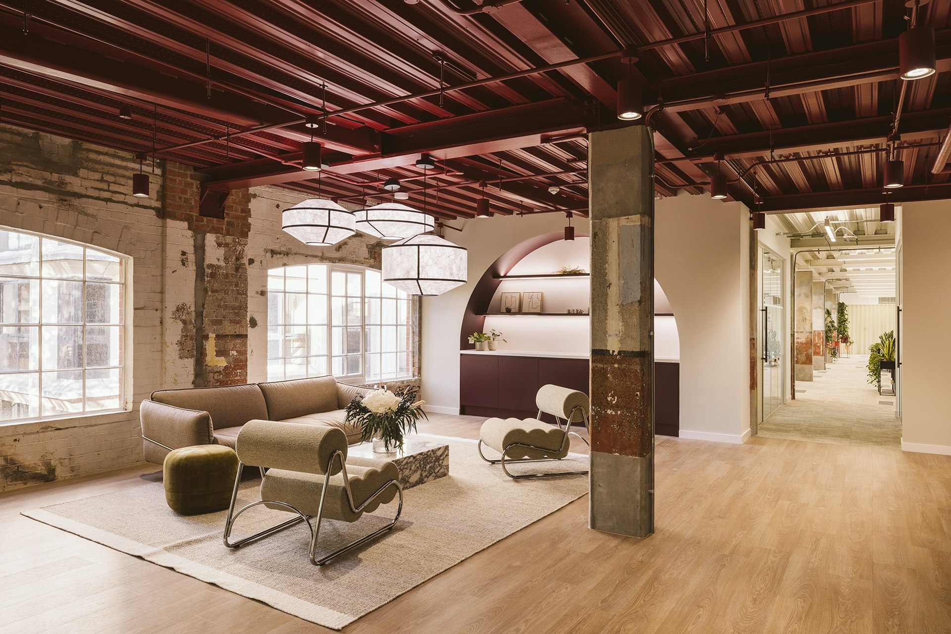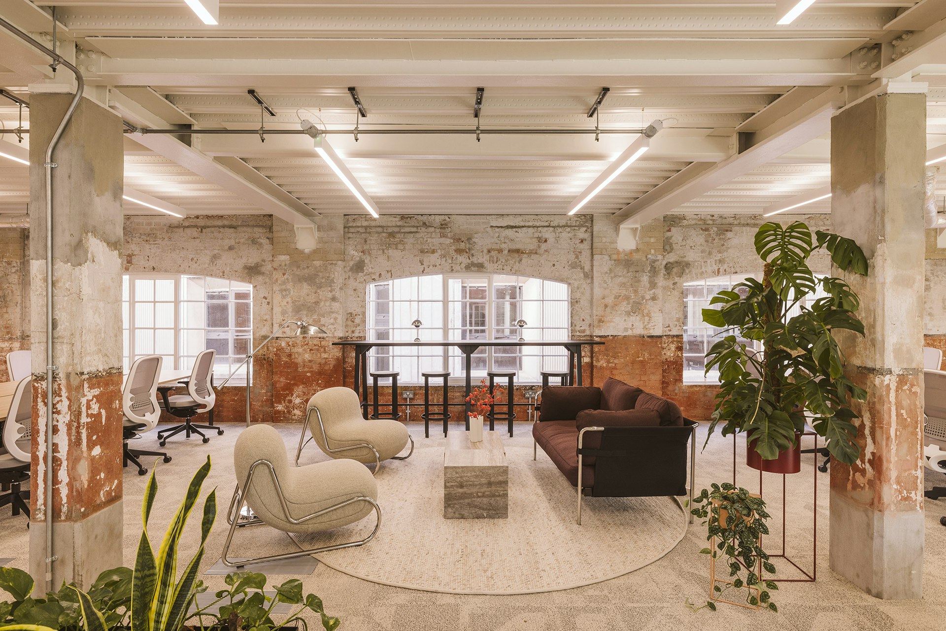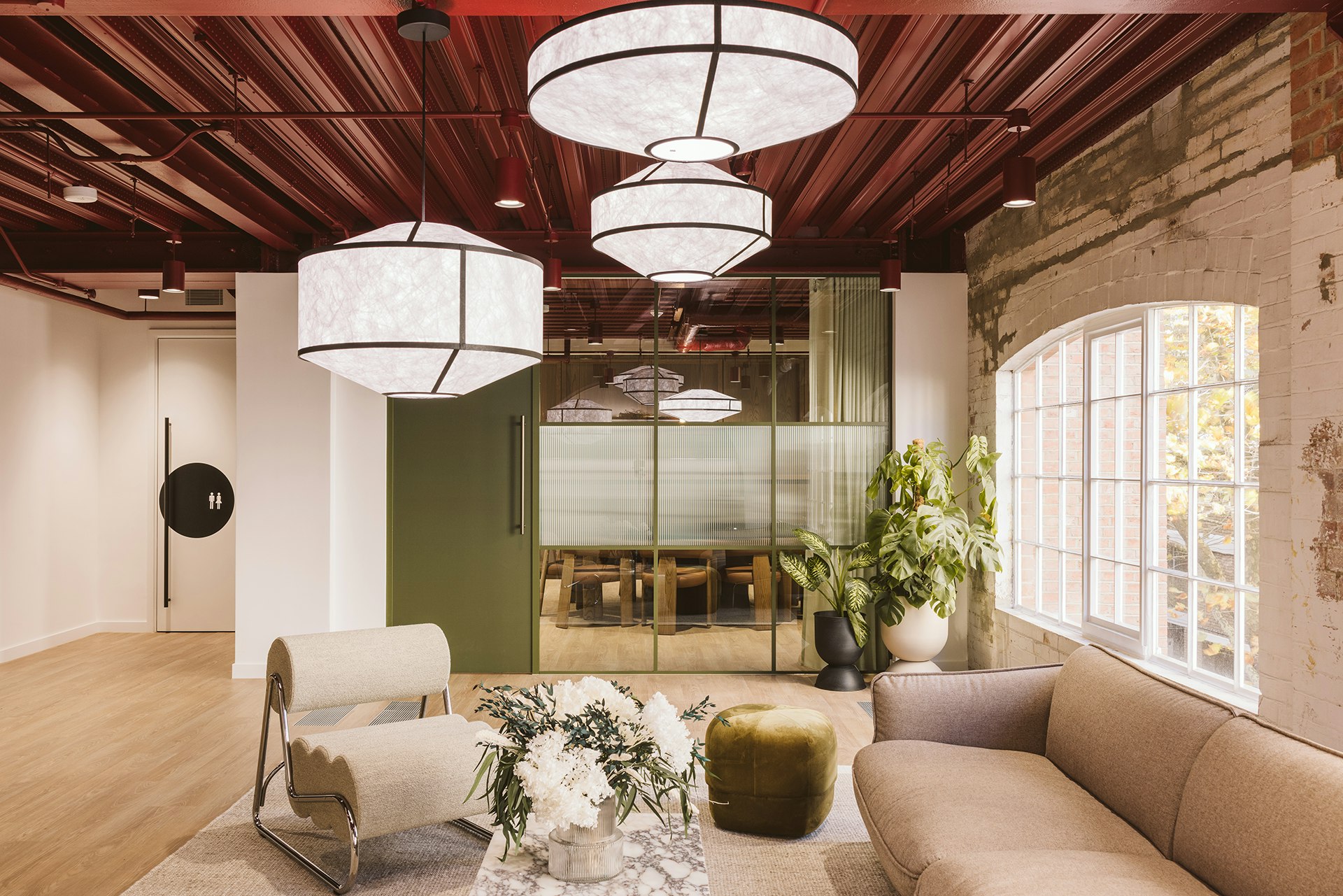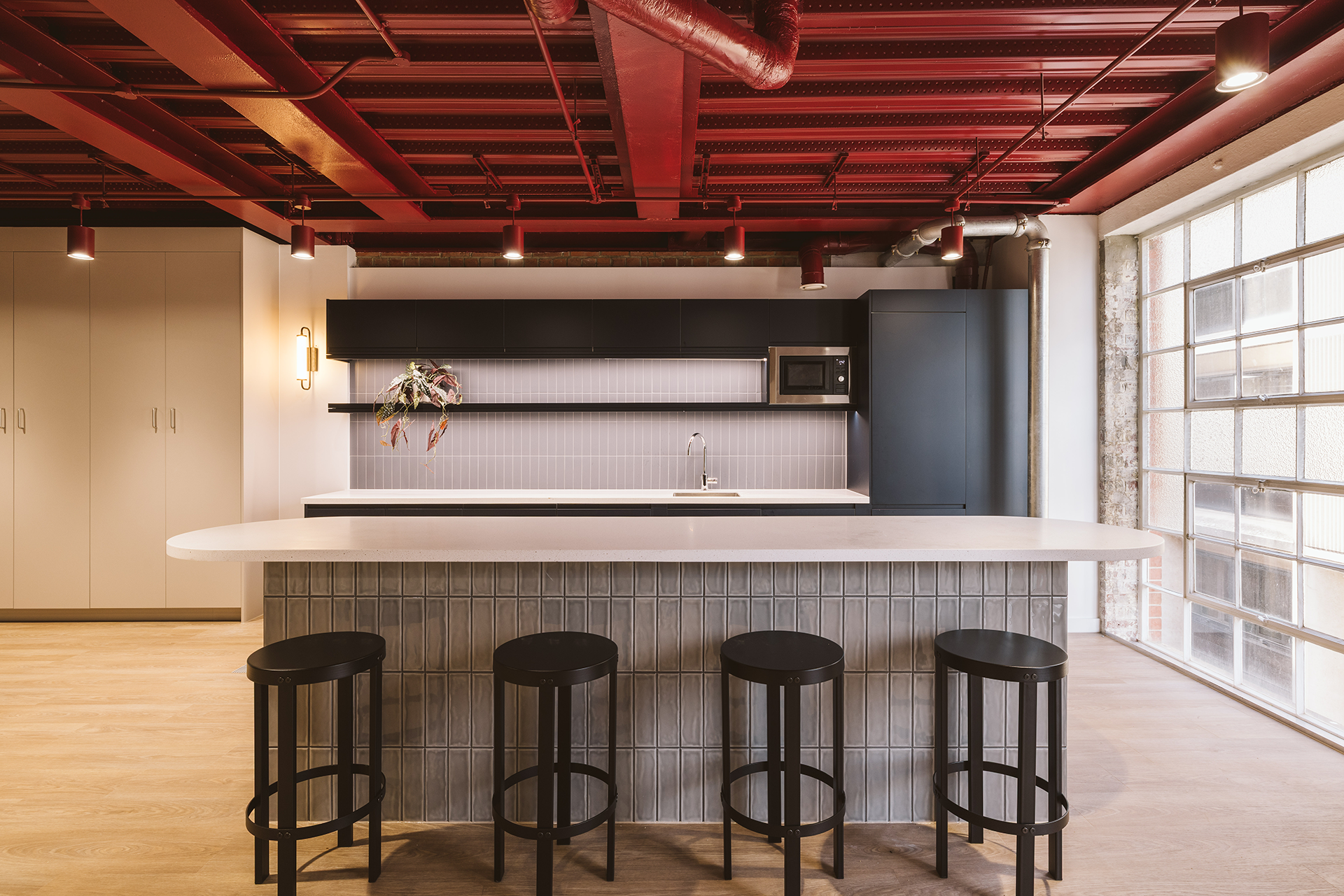 The starting point for this space was the building itself, which already had a strong architectural and industrial presence. The intent was to respond to this CAT A shell while strengthening it through contemporary design. Exposed brick, steel structure and generous glazing provide texture, proportion and daylight. Rather than competing with these elements, the interior works alongside them to create a cohesive workplace. With a warm and controlled material palette, the interior choices balance the industrial shell. For example, timber introduces tactility and warmth, while muted tones and black metal details reinforce continuity with the structure and sash windows.