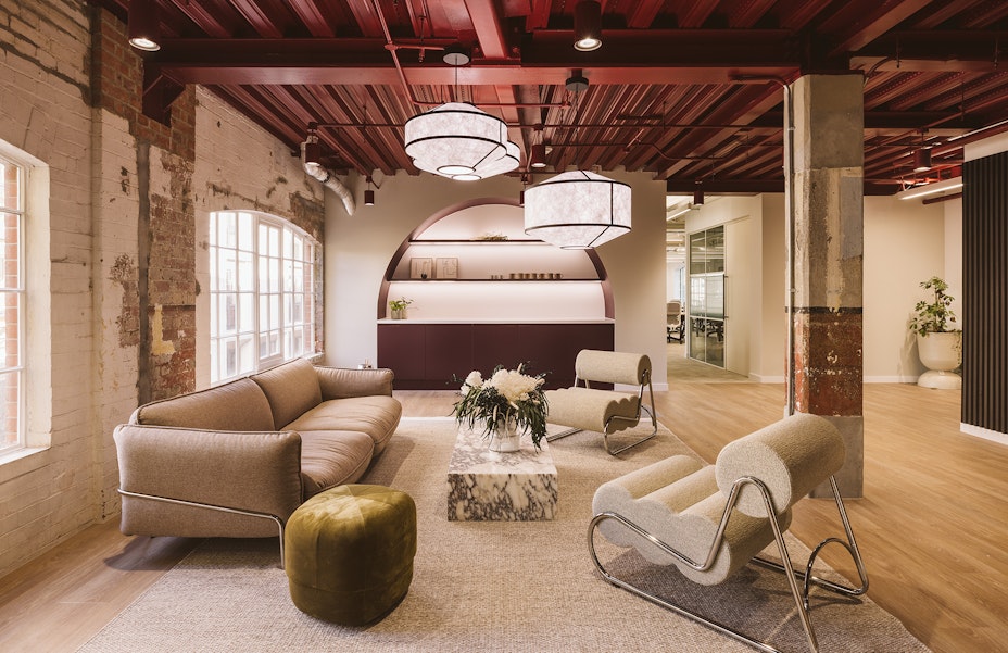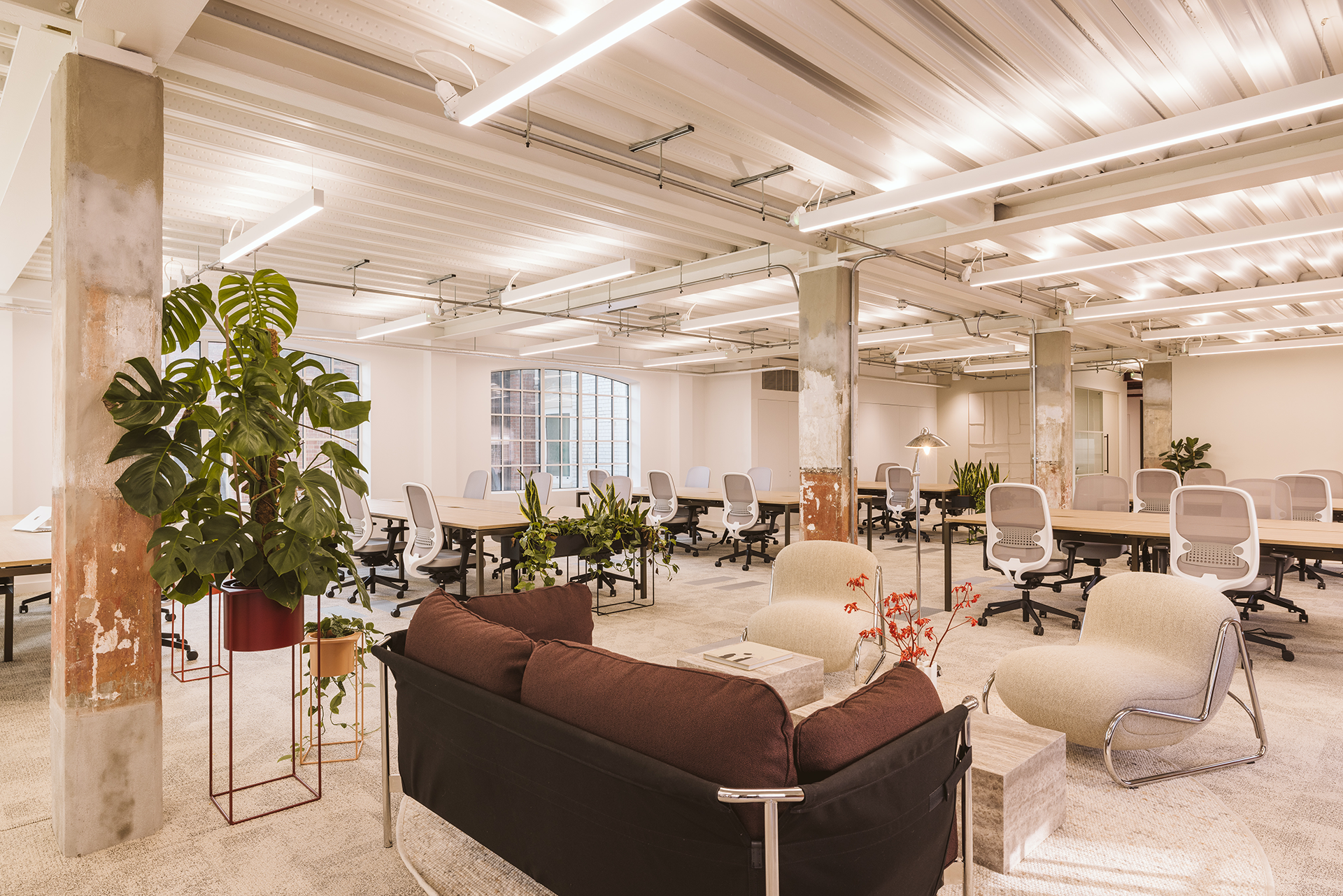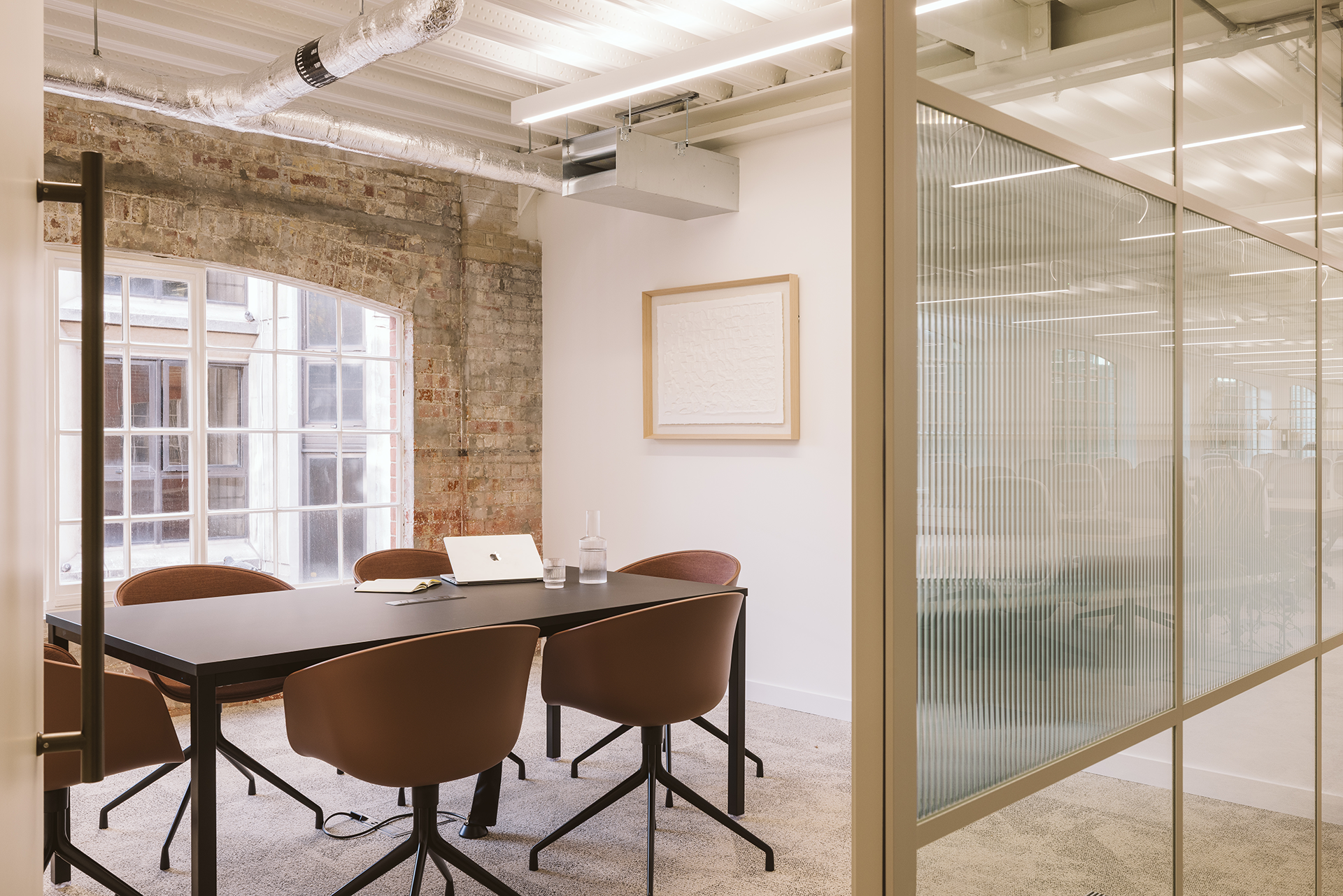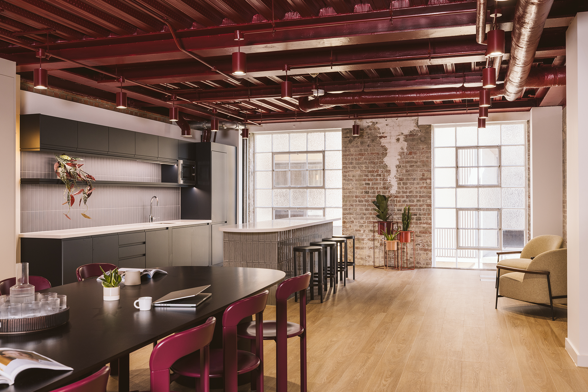 The starting point for this space was the building itself, which already had a strong architectural and industrial presence. The intent was to respond to this CAT A shell while strengthening it through contemporary design. Exposed brick, steel structure and generous glazing provide texture, proportion and daylight. Rather than competing with these elements, the interior works alongside them to create a cohesive workplace. With a warm and controlled material palette, the interior choices balance the industrial shell. For example, timber introduces tactility and warmth, while muted tones and black metal details reinforce continuity with the structure and sash windows.