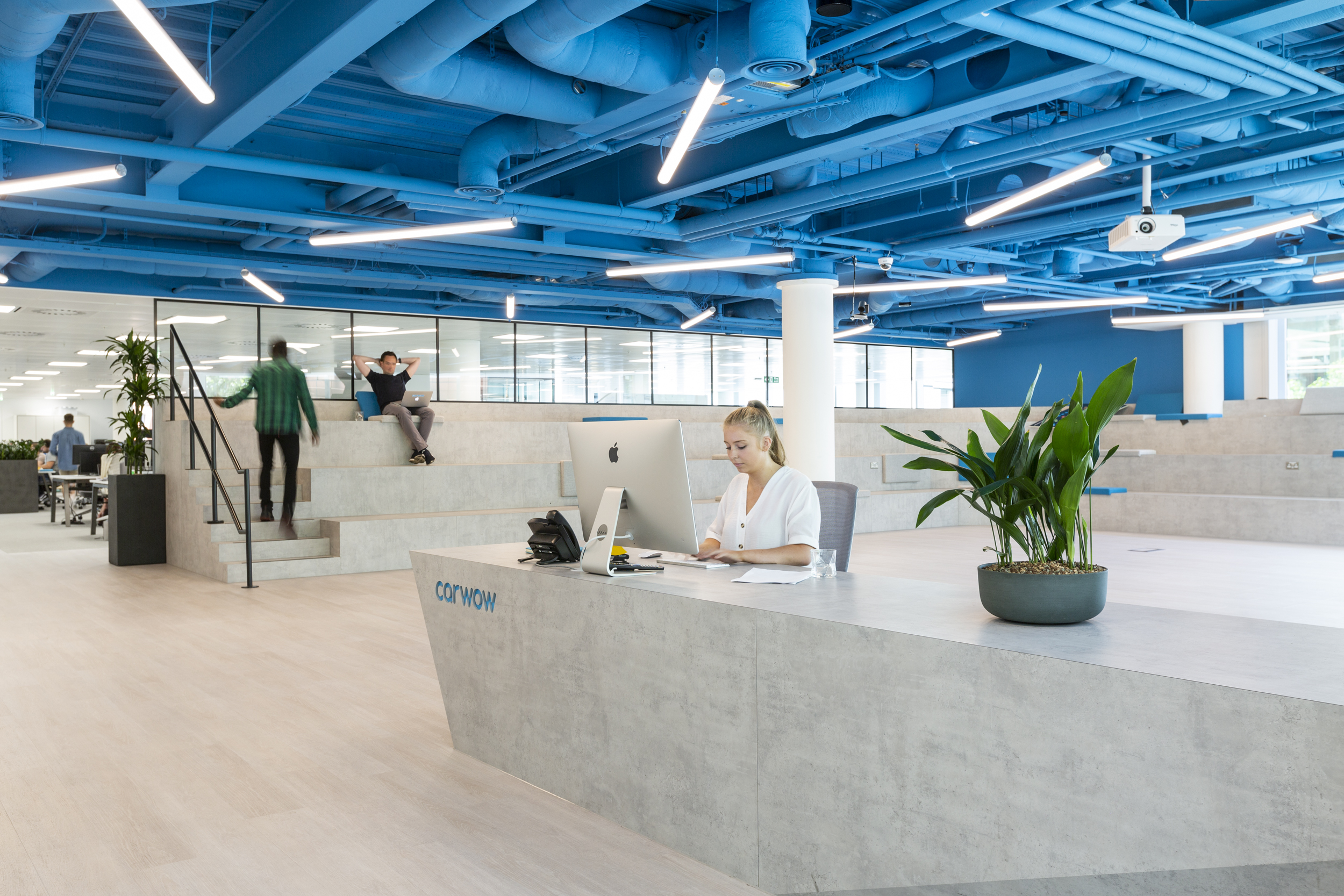 The ‘Carwow blue’ ceiling brings the WOWfactor, where all exposed ductwork has been painted in the same colour. It’s a striking talking point in the front of house area –a large space that is not only a reception but also a company meeting room, collaboration zone and event space.
