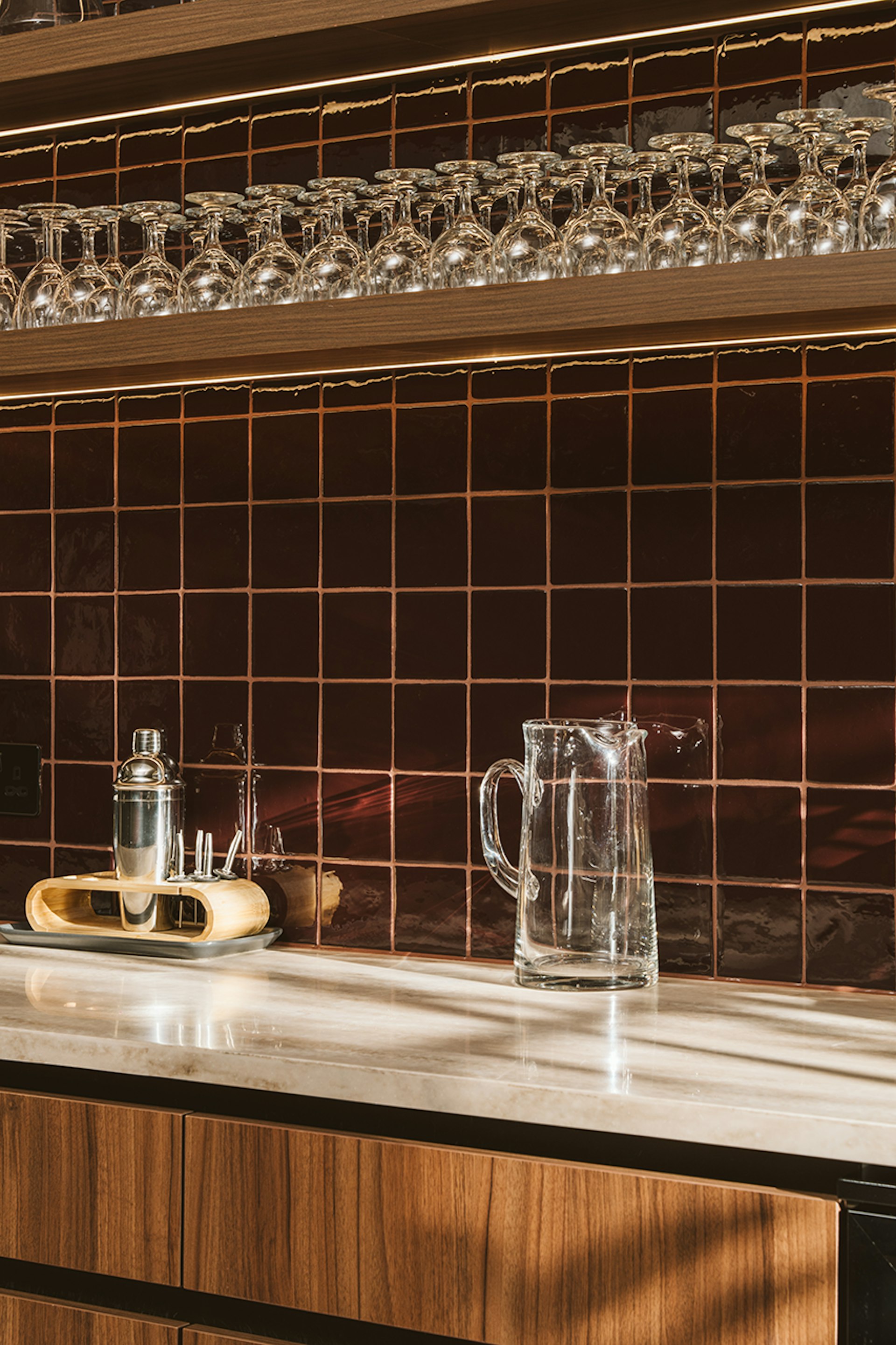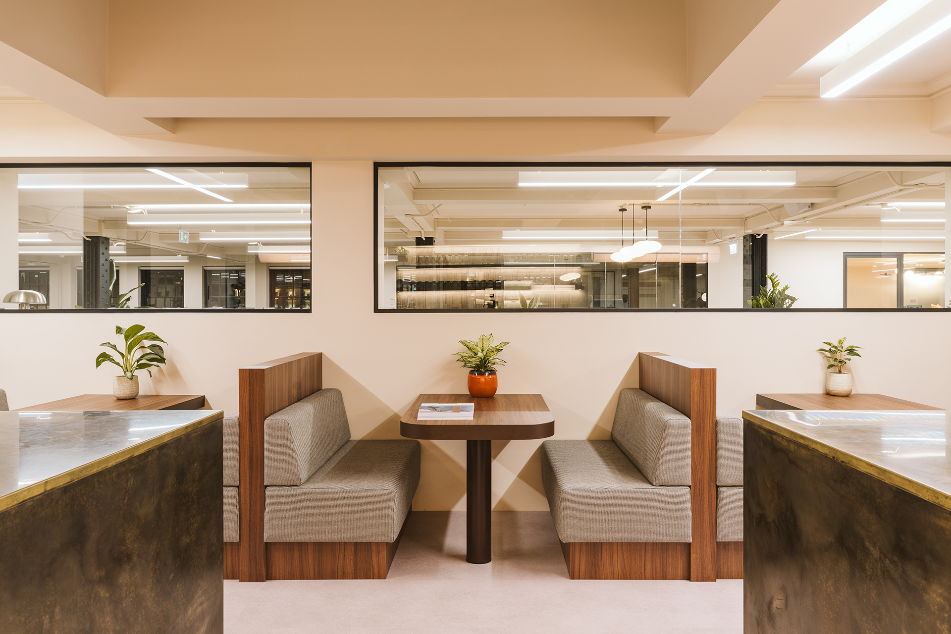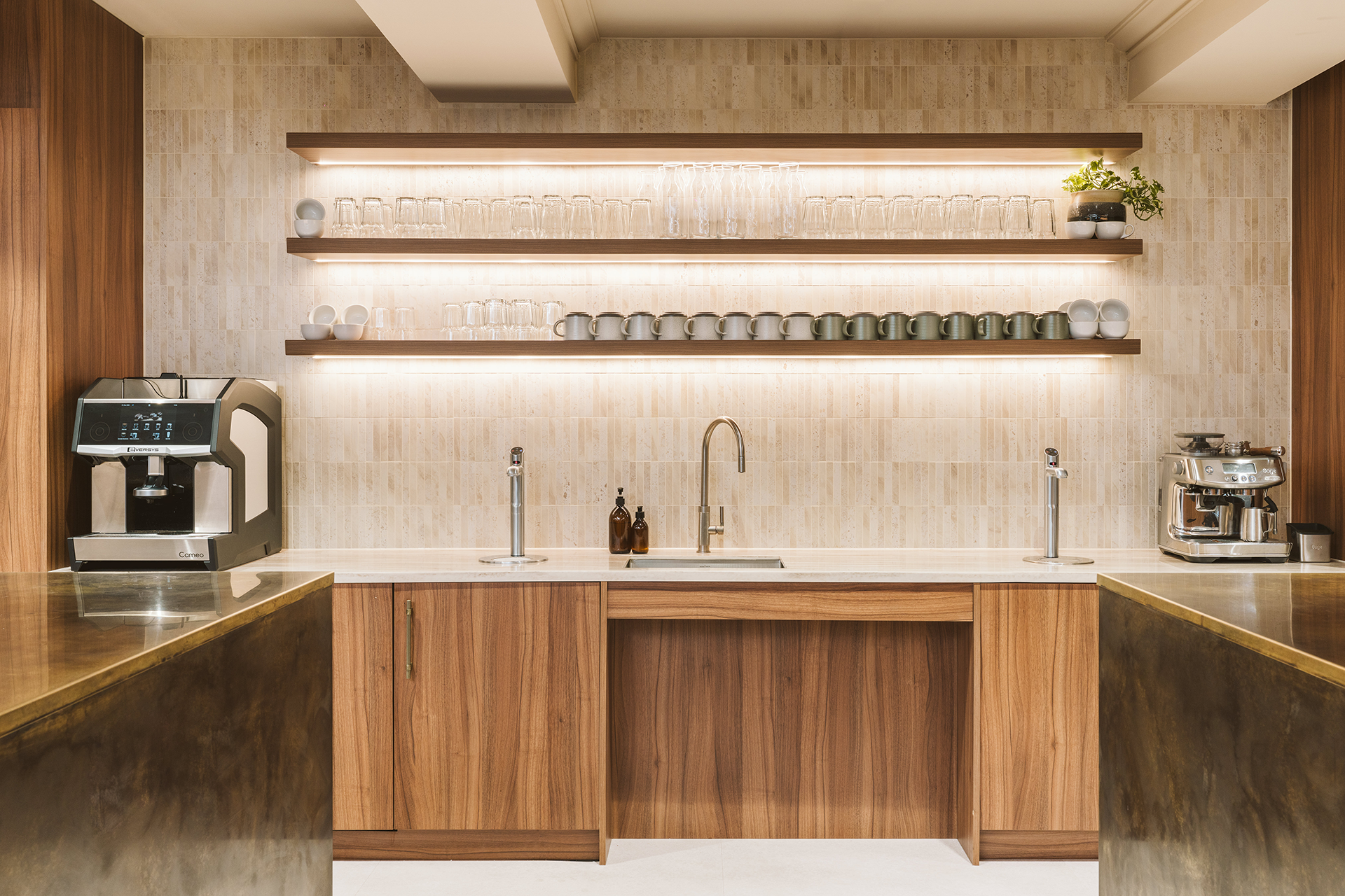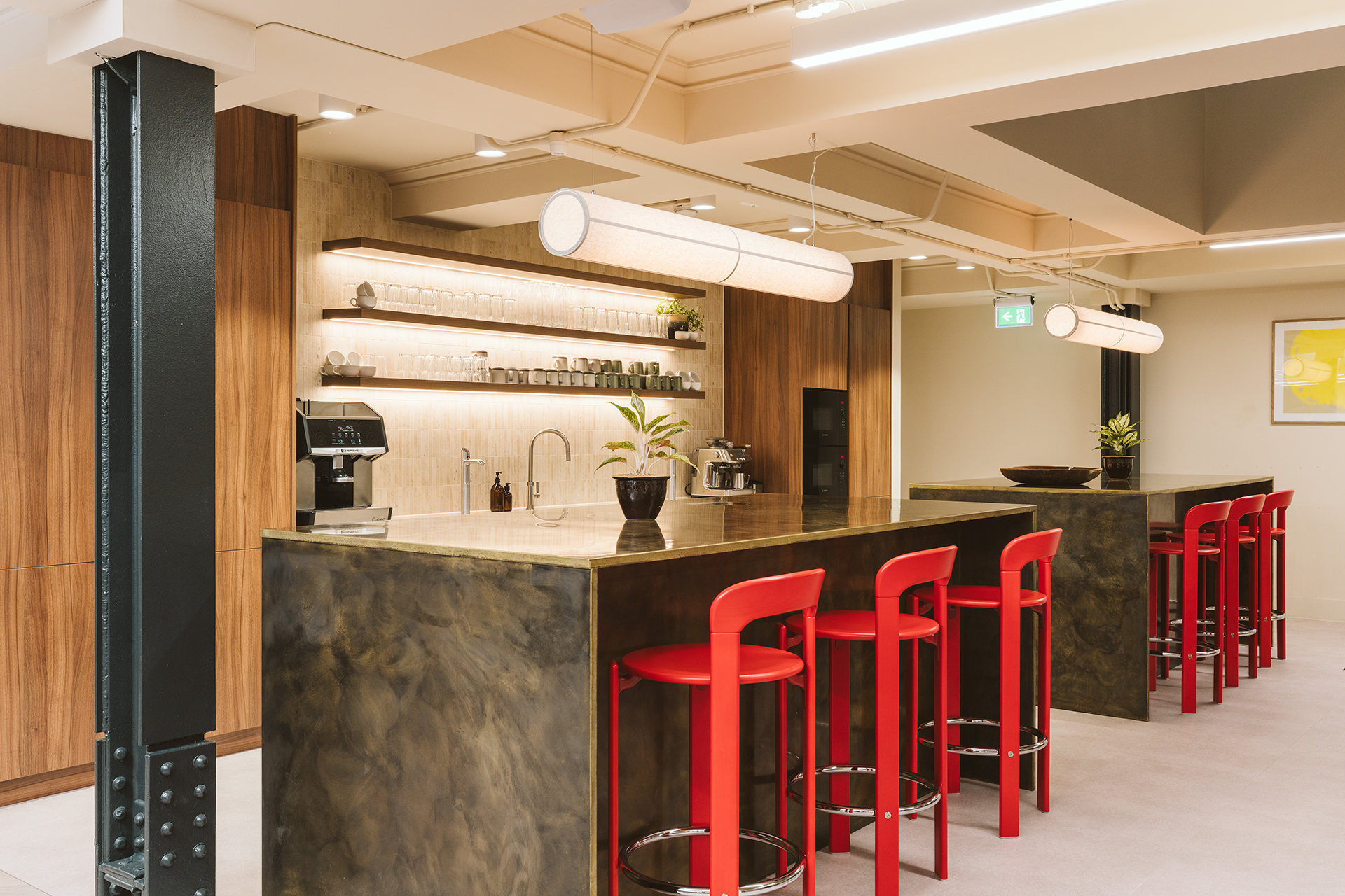 Inspired by Hugo Toro and Frank Lloyd Wright, our design for Cleo reveals a thoughtful blend of high-impact materials, paired with a sophisticated application. The aesthetic is deliberately warm, balanced and comfortable through intentional interplay and contrast of softness, bold colours and striking textures. This is seen most evidently with the layered approach to materiality throughout the space. With a generous application of warm timbers, alongside metal accents and a considered injection of colour, the space feels more like a well-curated residential space than a standard workspace. One key area where this is most apparent is the kitchen breakout, where the antiqued brass countertop is paired with vibrant red bar stools. Alongside this, rich and bold details of the joinery choices, such as the plum tiles in the bar area, and checkerboard carpeting in one of the many collaboration zones, blend a classic elegance with contemporary flair. This eclectic mix of materiality, colour and texture provides a sense of tactile luxury – creating a distinctive edge from the corporate landscape that Cleo occupies.