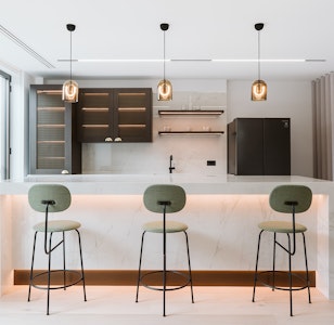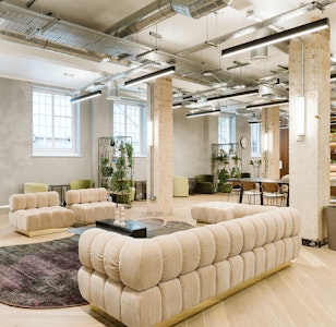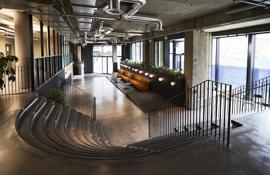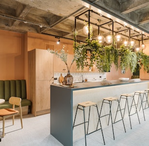The second has a fully tiled banquette seating and breakfast bar with rattan suspended shelving above, which ties in with the arched rattan and timber entranceway and impressive booths which welcome people into the space. The use of natural, delicate rattan softens the overall edge of the building whilst the Crittall portioning and polished concrete effect honors it. The palette cleverly compliments the new reception scheme and timber ceiling details within the atrium.
