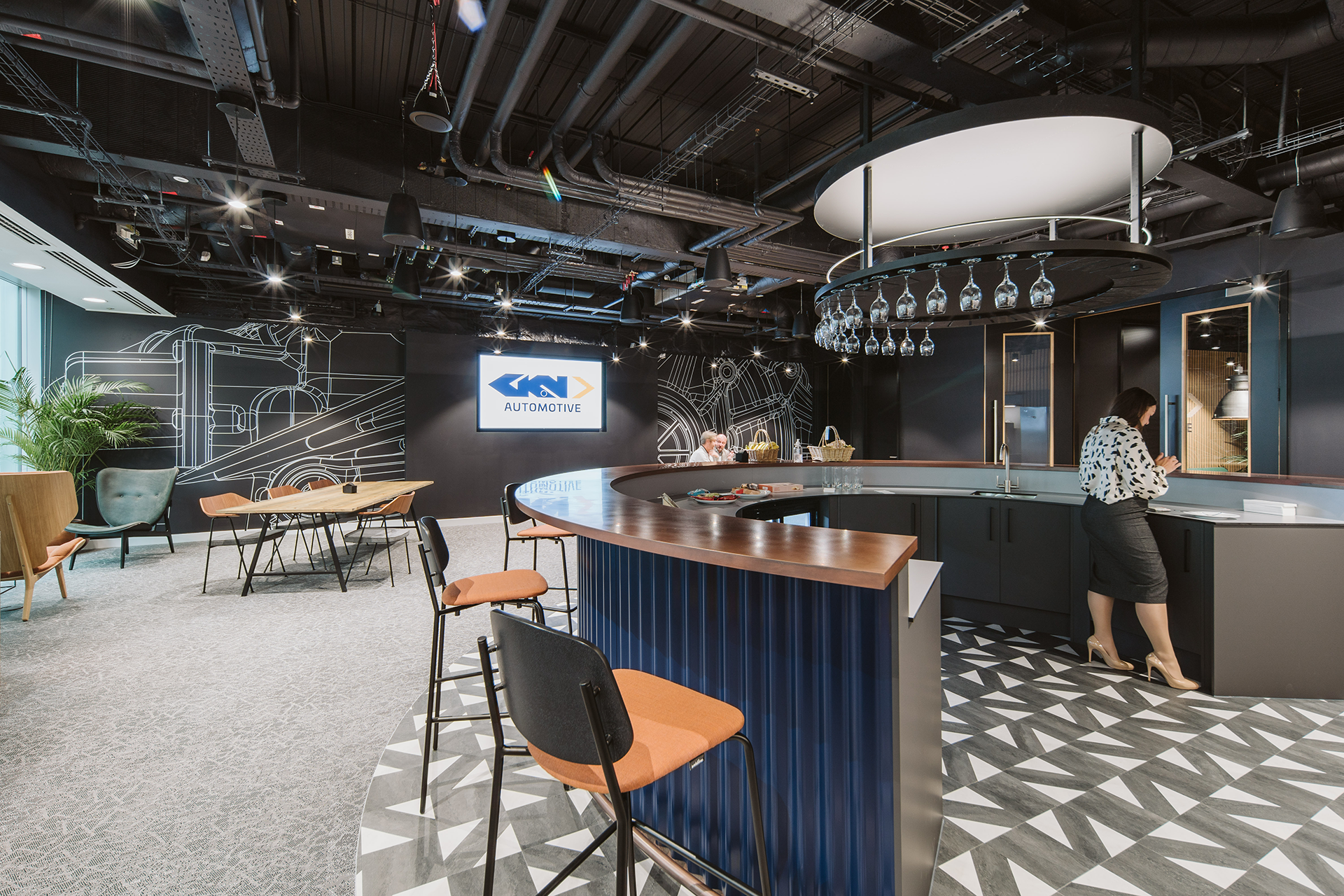 Design inspiration was initially drawn from the geometry and beauty in the raw engineering components in GKN Automotives own product lines, tied in with industrial and contemporary interiors frequently seen in hotels and restaurants. With breakout spaces typically being the central hub of the modern workplace, this area especially needed to feel inspiring and show off GKN’s culture. Featuring a mixed use of space such as the booth seating and oversized lounge chairs – this area has the potential to function from day-to-night when required. Industrial elements typically spotted when sipping a Punk IPA in one of BrewDog’s bars was referenced for how the kitchen space could feel. We think this was perfectly executed, don’t you think?