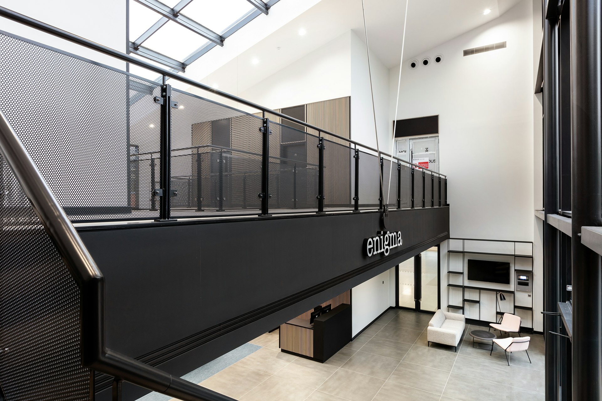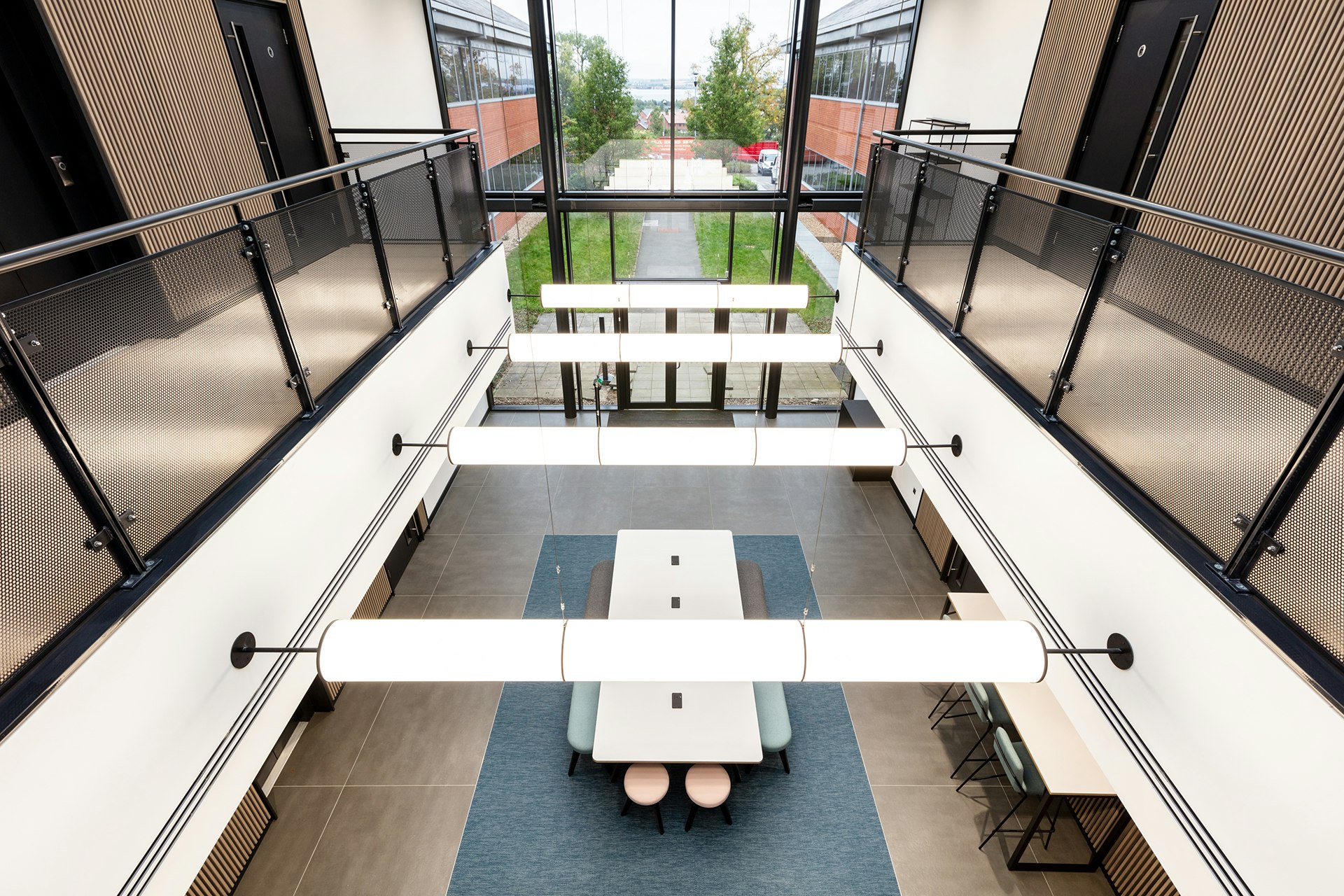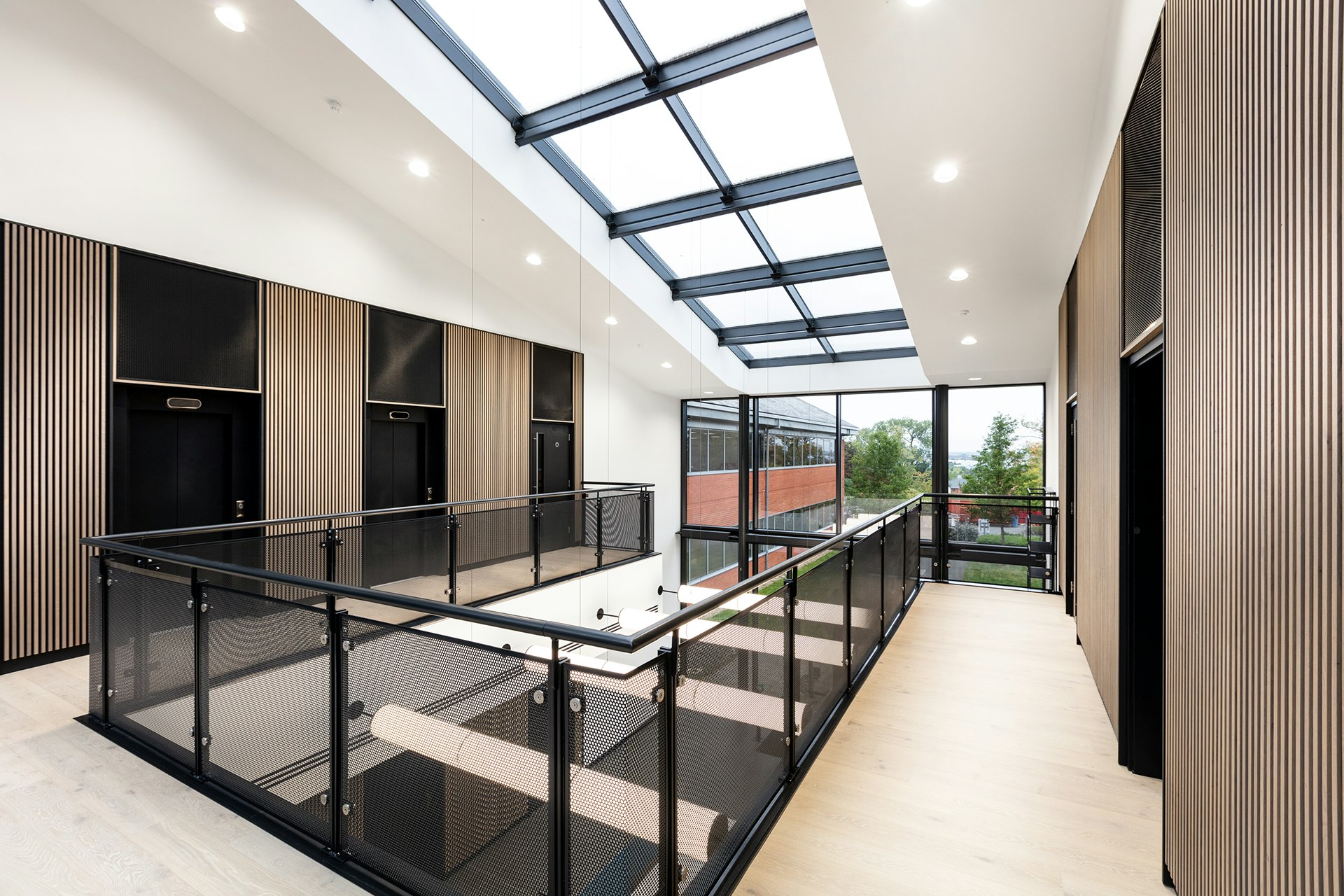 Double-height Cat B reception space, which began by stripping all existing finishes and services to reimagine the entry experience.