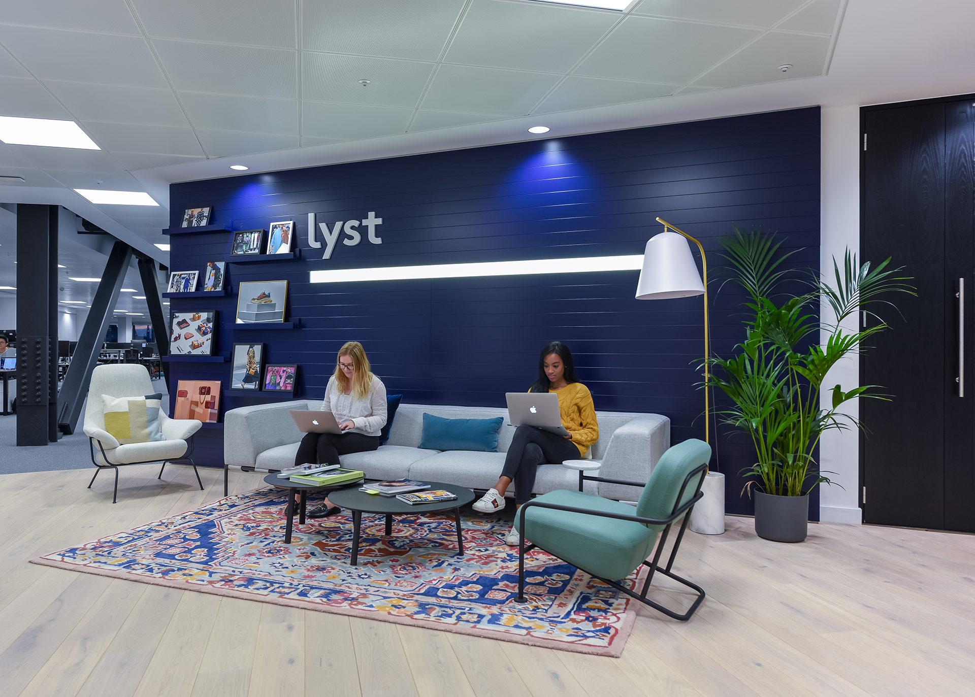 Lyst, Thirdway, and our furniture partners Tribe collaborated closely to make sure the finishing touches reflect the brand’s vibrancy and innovation. Our design features broad swathes of Lyst’s primary deep blue brand colour, paired with a palette of secondary blue hues and contrasted with bold pink and apricot detailing.