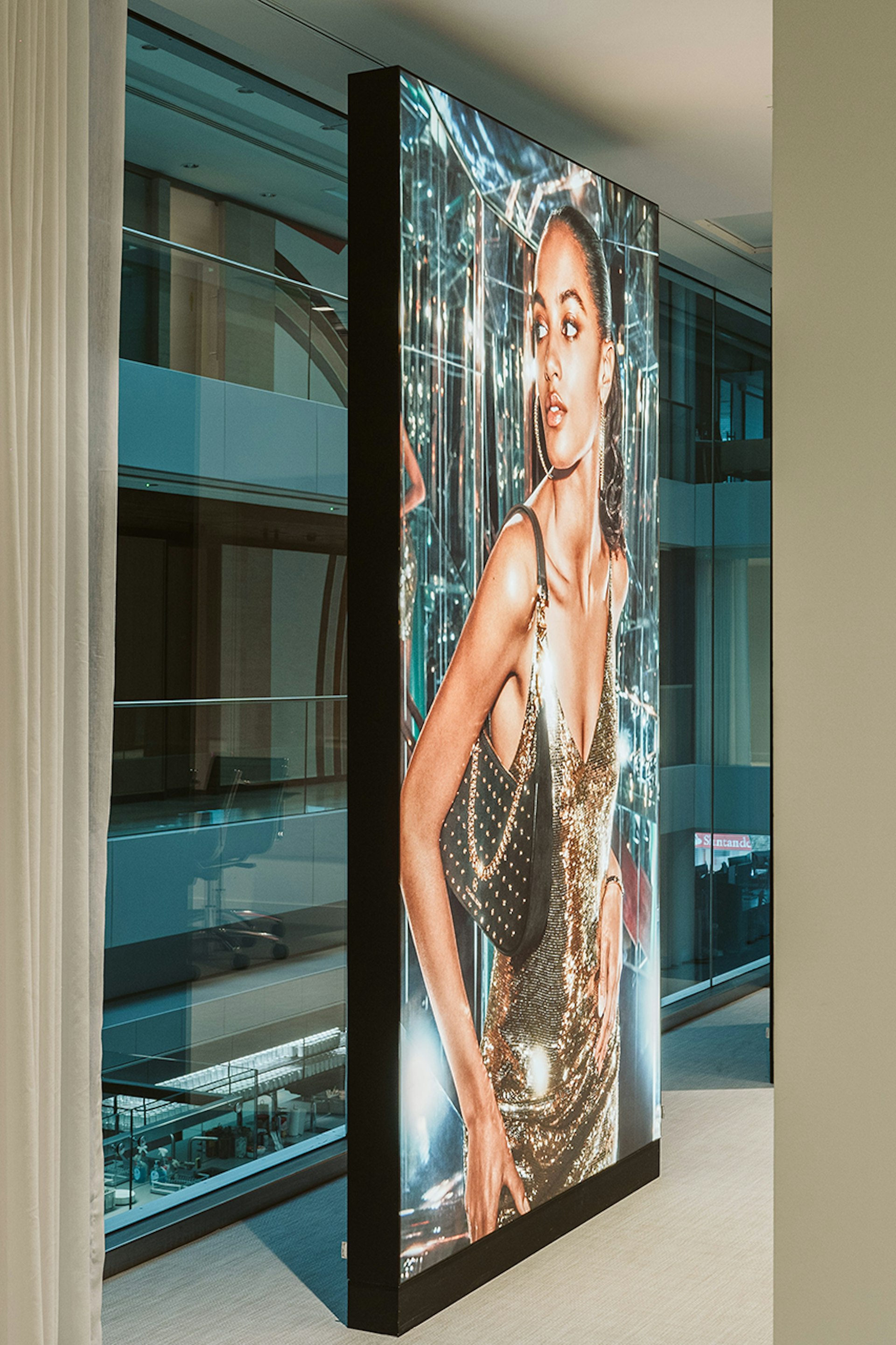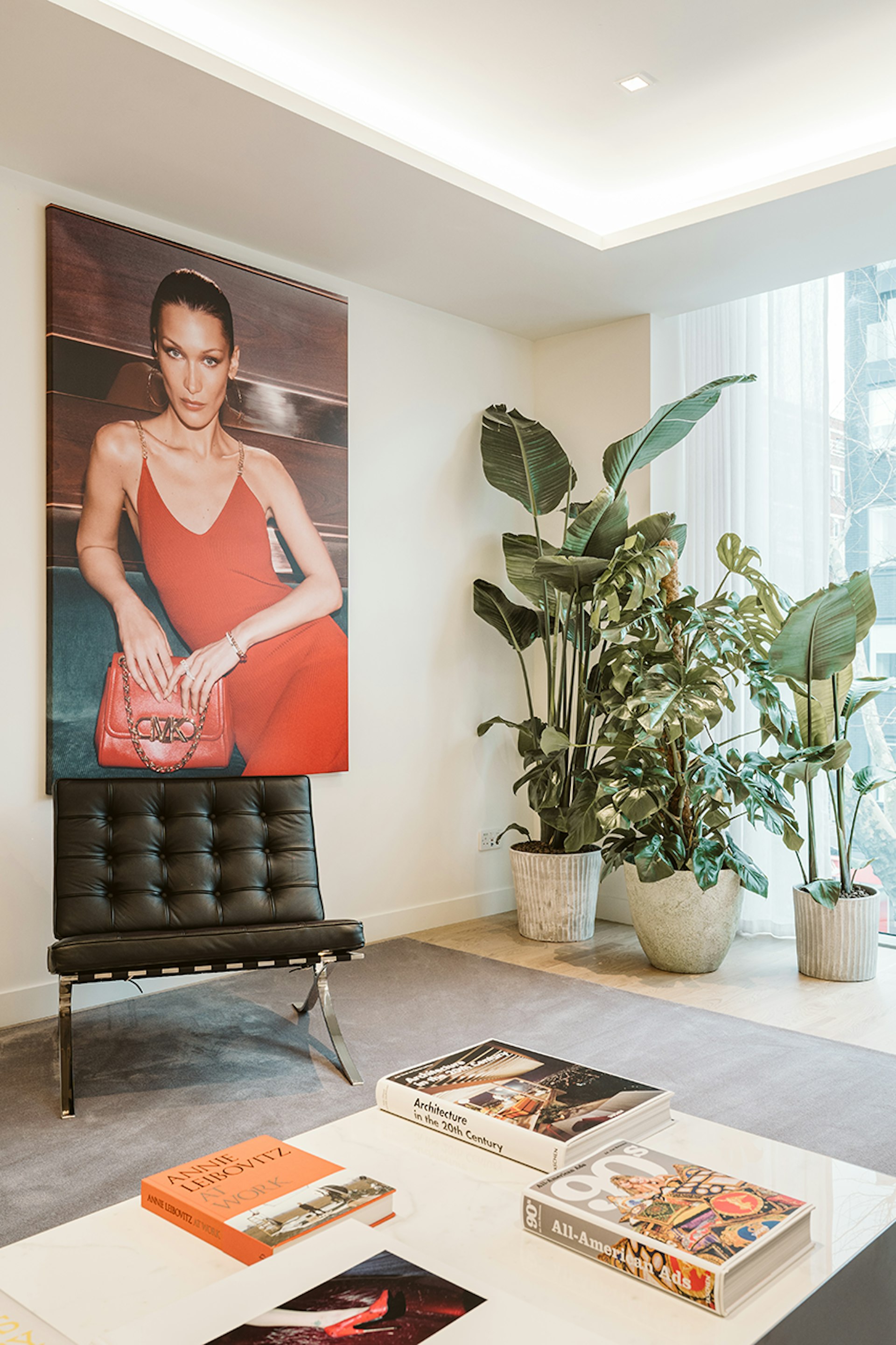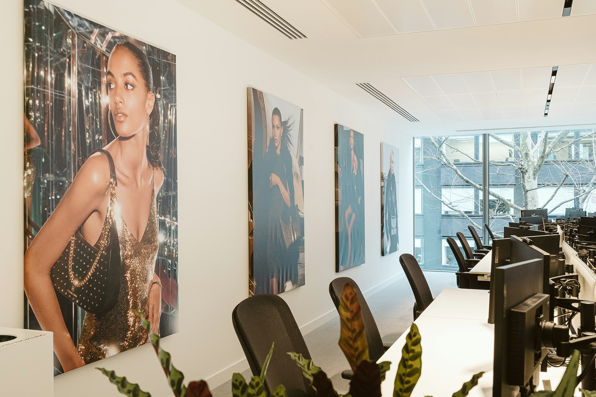 For the next phase of this project, we stepped in for the fit and build. The look and feel of the space needed to be first and foremost on brand, but with a neutral colour palette that incorporated high end finishes. We added Bolon and timber floors throughout, crittall glazing to give that ‘shop front’ feel and used statement light fixtures in each space. With striking Michael Kors imagery peppered throughout the space in large light boxes, the finished space is light and airy, classic, on brand and is the perfect environment for people to collaborate, develop ideas together and build company culture.