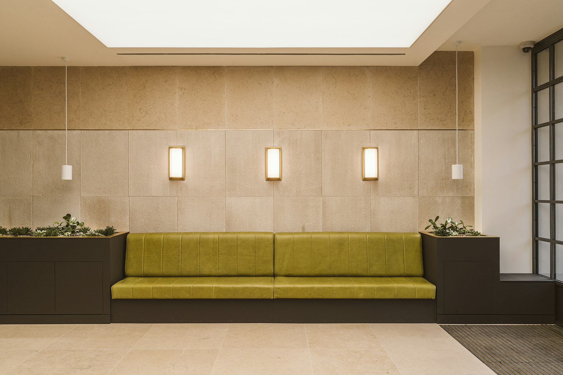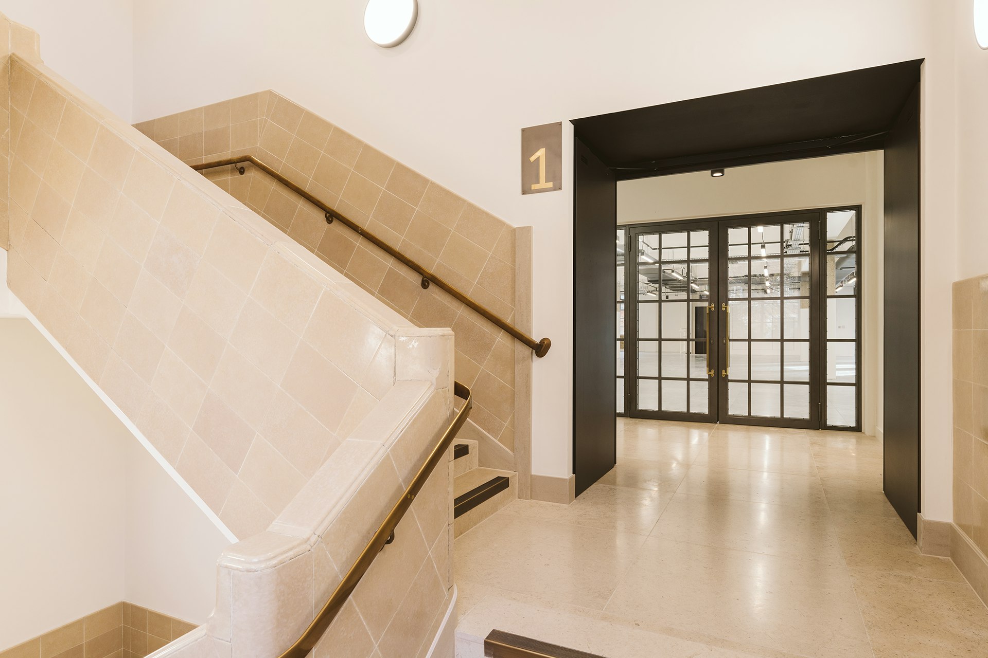 In the reception and communal areas of the building, heritage was again at the forefront of our design—in the reception, we used hand-chiselled stone flooring from Portugal, providing a luxurious and classic feeling to the space, perfectly matching the heritage features of the façade. While in the stairway, we kept the existing tiles, maintaining this key element of heritage but also modernising the space with bronze finishes—a luxurious and elegant nod to the original copper pipework of the building.