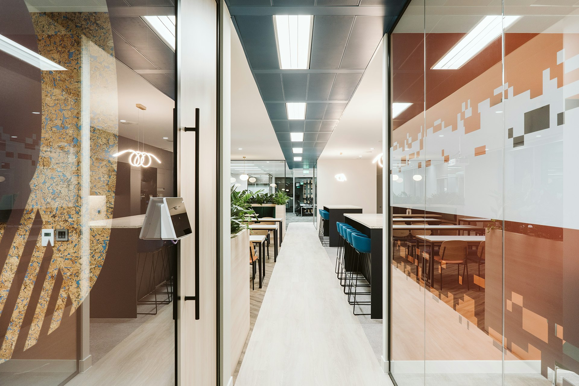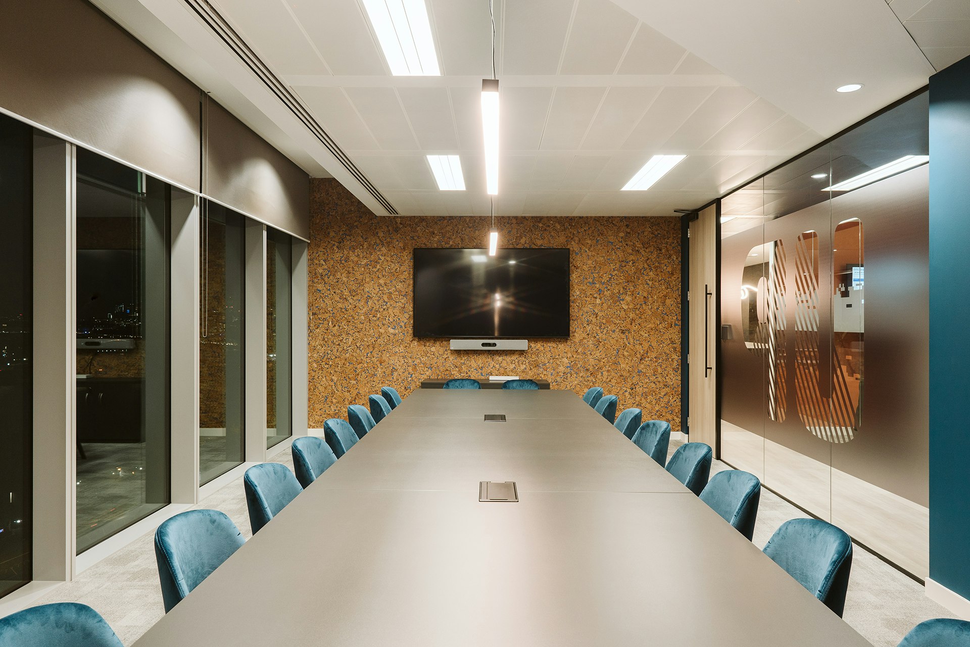 Perhaps one of the most crucial spaces to consider was the large breakout kitchen area. To be used as a multipurpose space, the rich green and blue accent tones add a real depth to an otherwise slick and clean space. The introduction of family-style seating encourages the team to sit and socialise together both during the day and into the evening to celebrate company culture.