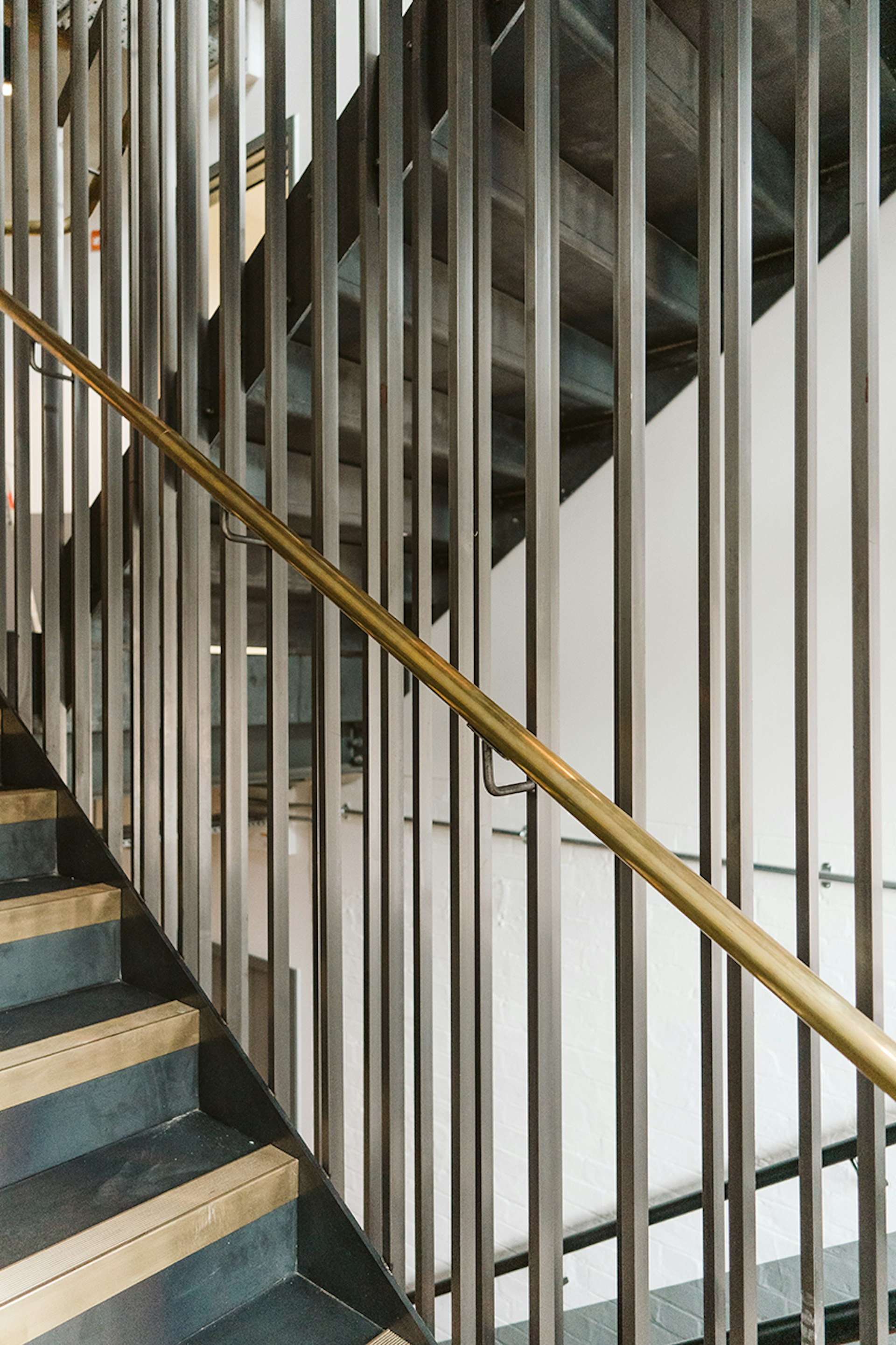 Strong materials like brass and iron pay homage to the area’s industrial history, as do the warehouse windows on the ground floor. In contrast, natural timber finishes, greenery and carefully curated soft furniture encourage a modern feeling of comfort and community.