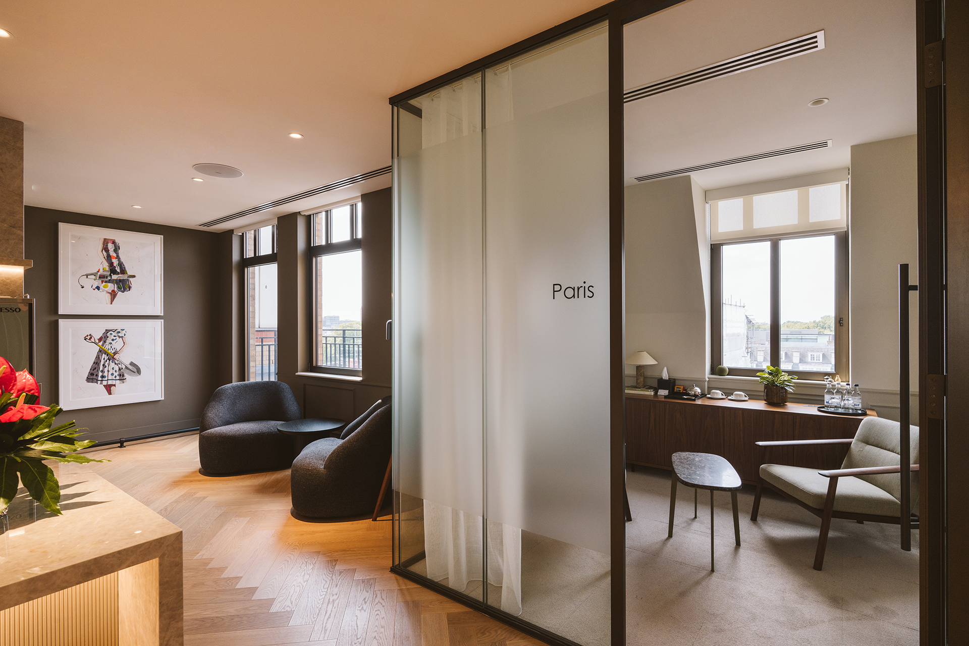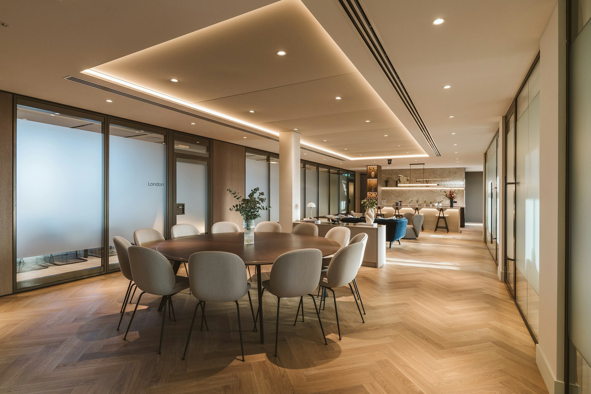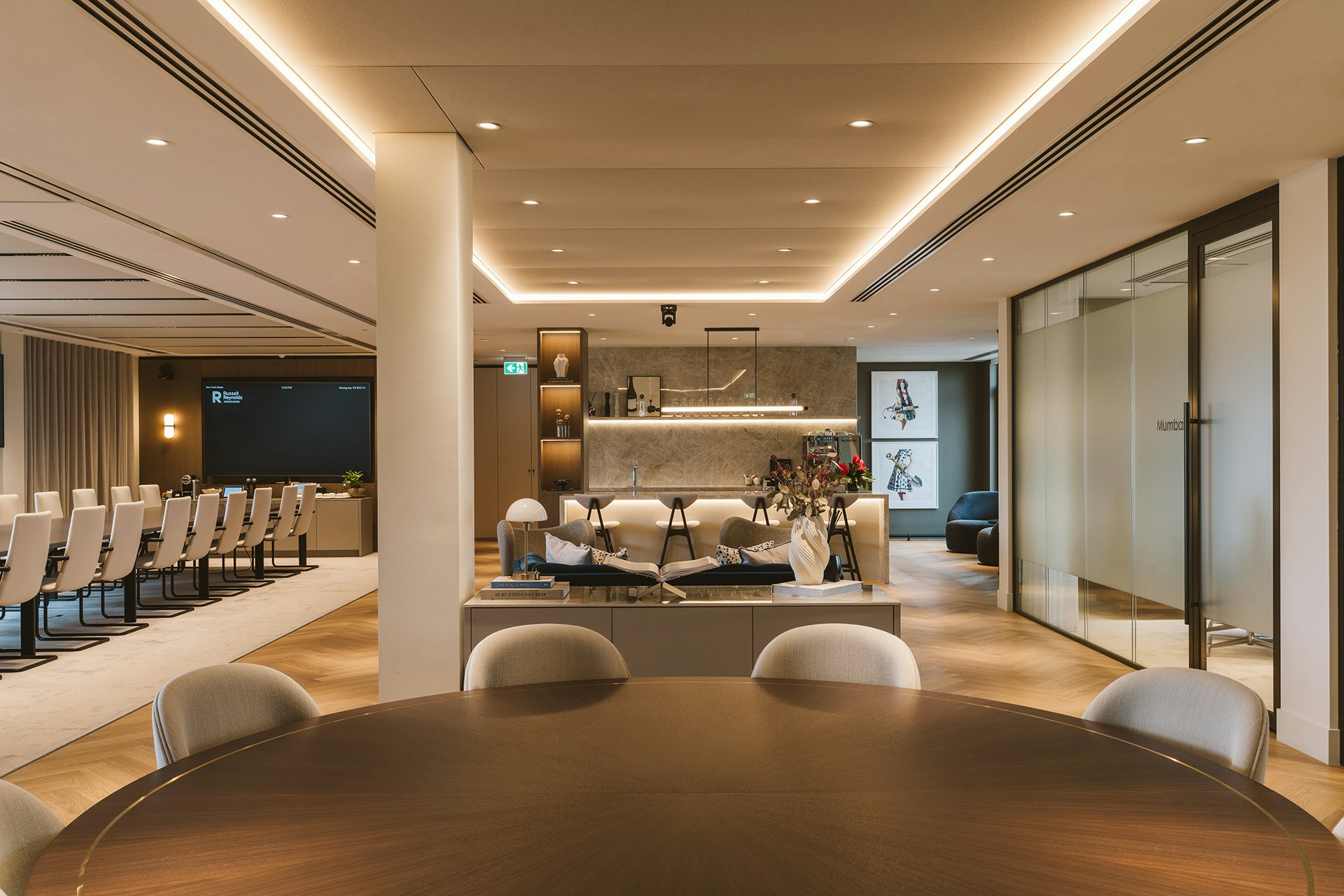 Occupying two levels of Almack House, our design for Russell Reynolds Associates captures the unique character of both their client and office spaces. On Level 3, our CAT B fit‑out serves the employees, combining practicality with elegance. While on Level 7, we crafted a refined CAT A & B client suite designed to impress.