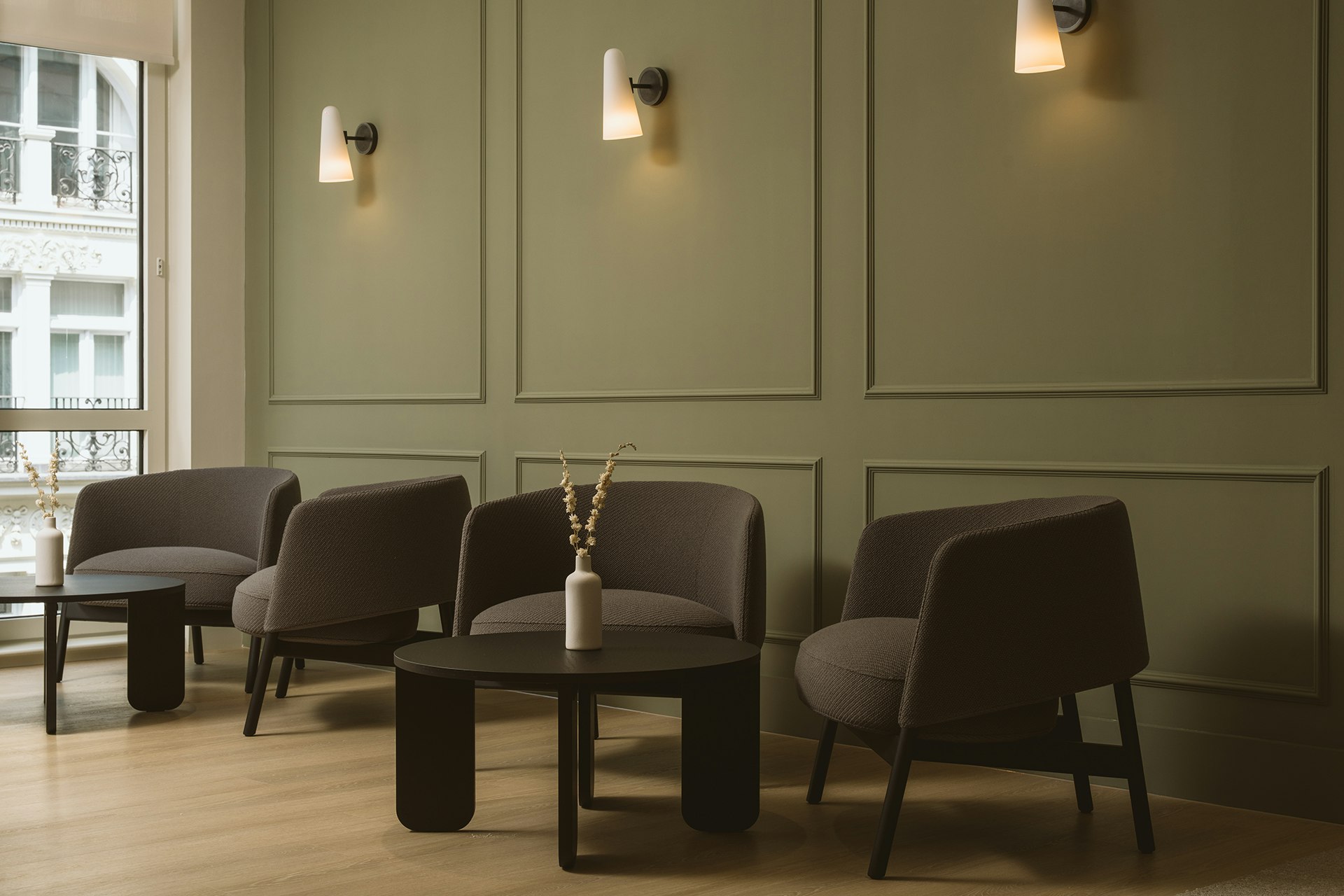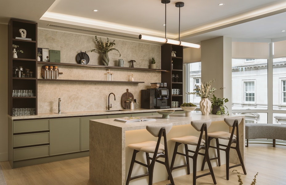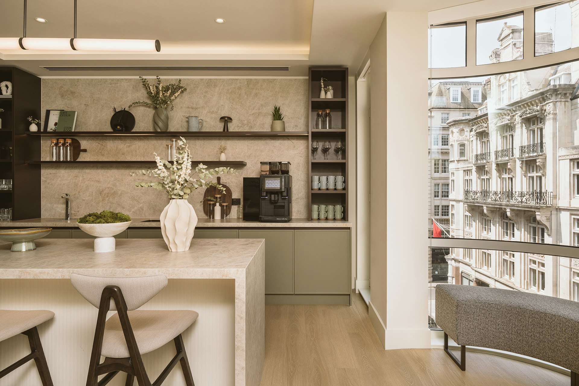 Taking inspiration from the architecture and interior design of the building, Almack House, the design of both floors is tailored, considered and a cut above, truly embodying the client and prestigious St. James location. On the third floor, our design focused on clean lines and premium materials, offering a somewhat traditional feel to the space. Examples of this are the Marazzi porcelain countertops and backsplash in the tea point area, as well as the Dado Rail wall panelling, painted in an olive green. These premium and luxurious design choices are, however, joined by a host of contemporary furniture pieces to juxtapose with the classic design features, ensuring that while inspired by the architecture of Almack House, the space also feels modern and elegant.