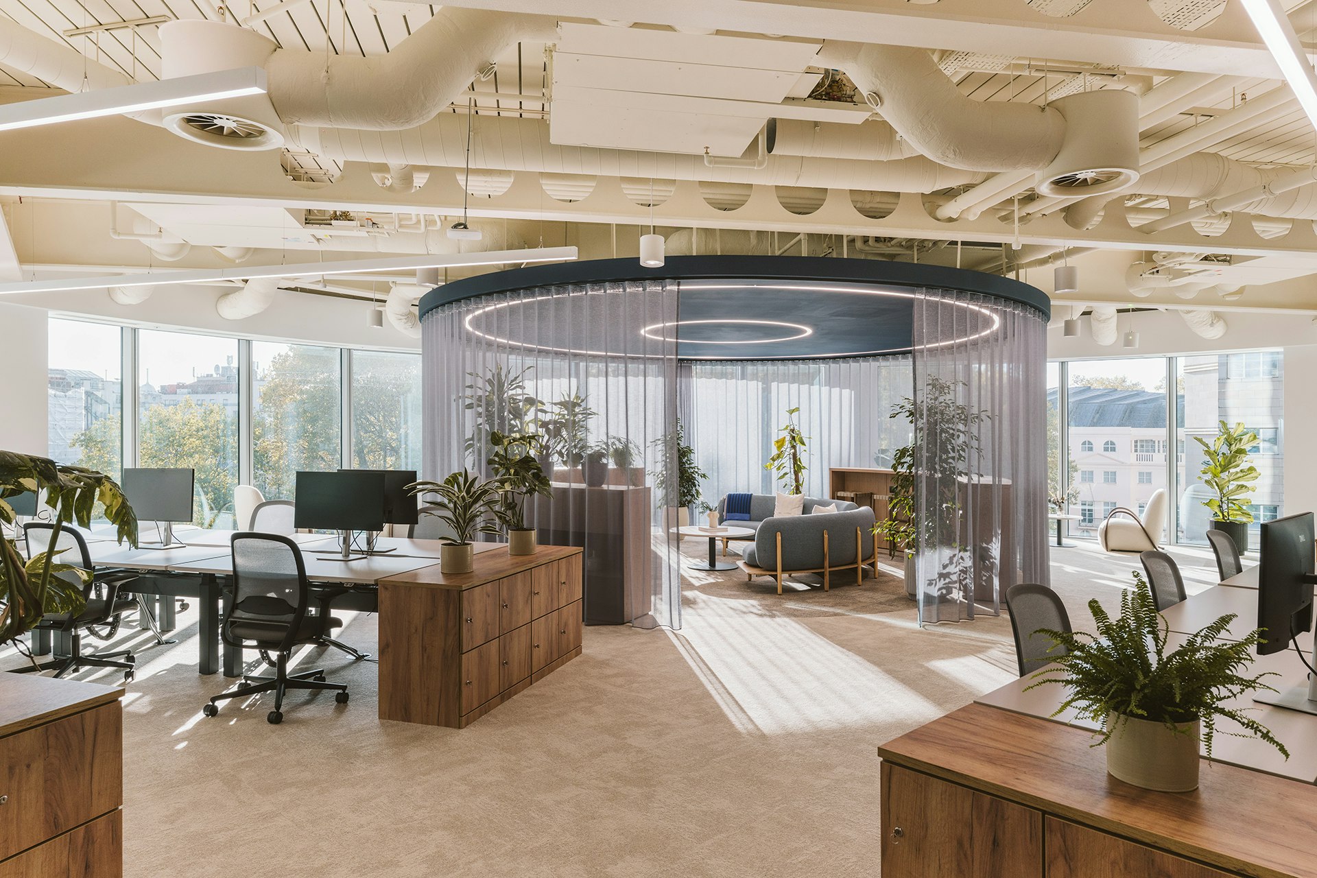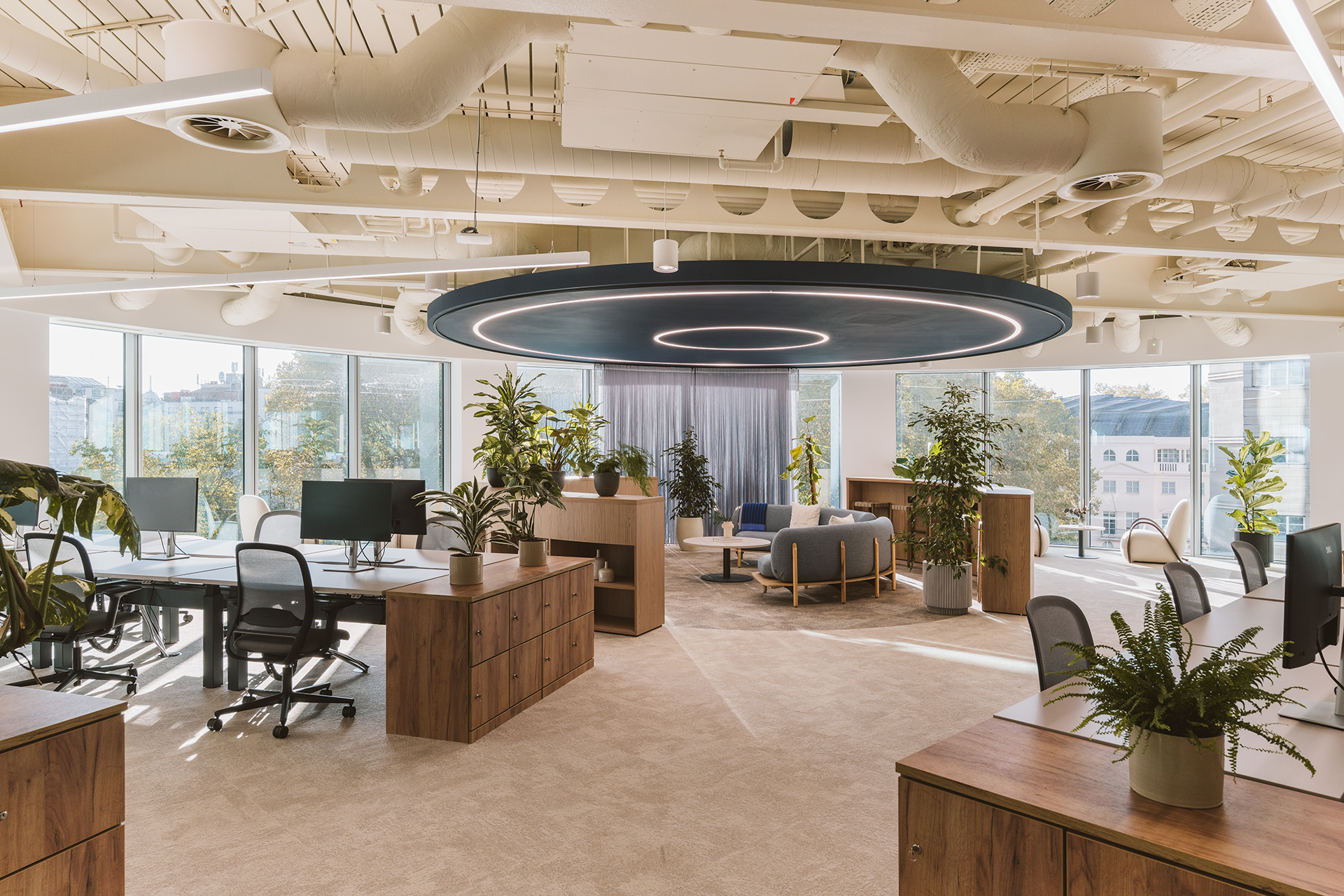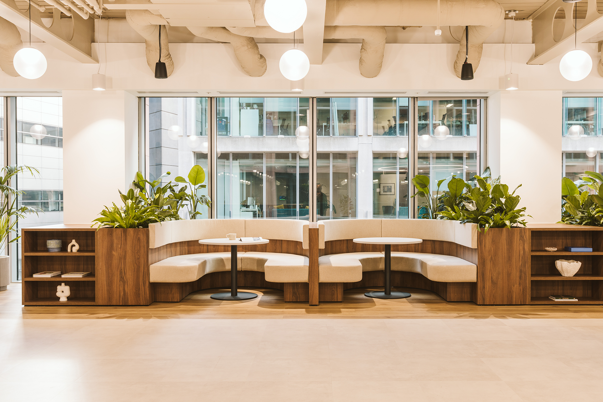 Whereas ‘The Spaceship’ facilitates spontaneous collaboration or team brainstorming, not only is this area placed amongst the main open plan area, to provide an easy flow of collaboration, but it is designed to look and feel like an ‘oasis’ amongst the desking. The circular shape of the space is mirrored through all aspects of this area, from the flooring to the curved furnishings, the sheer partition, and, of course, the bespoke light feature. These design aspects were chosen to amplify the area as a distinct collaboration space, and an alternative to a traditional desk. The large bay of windows provides great natural light to the area, and alongside the increased volume of planting in the area, fortifies the area as an ‘oasis’ for collaborative work.