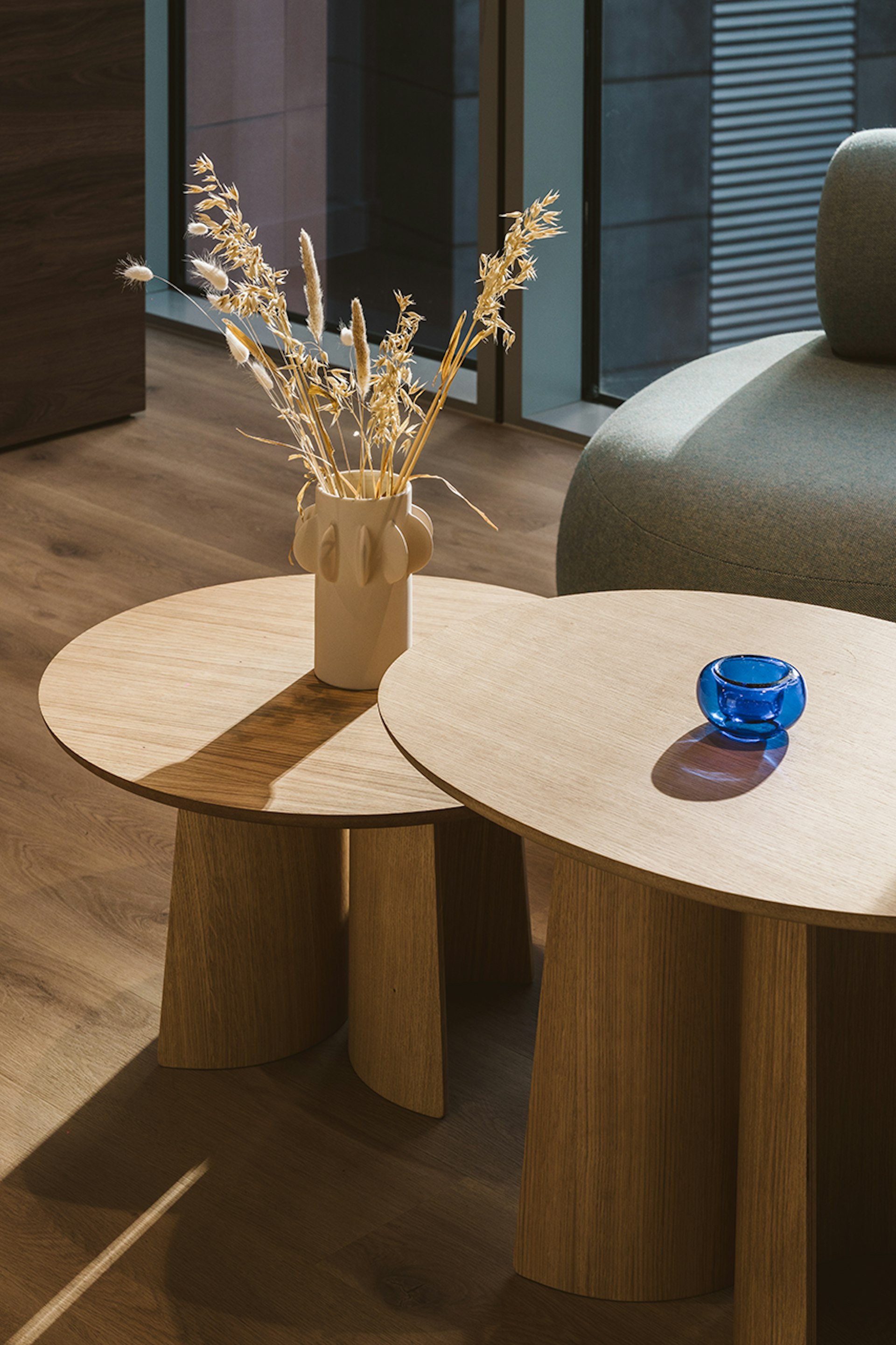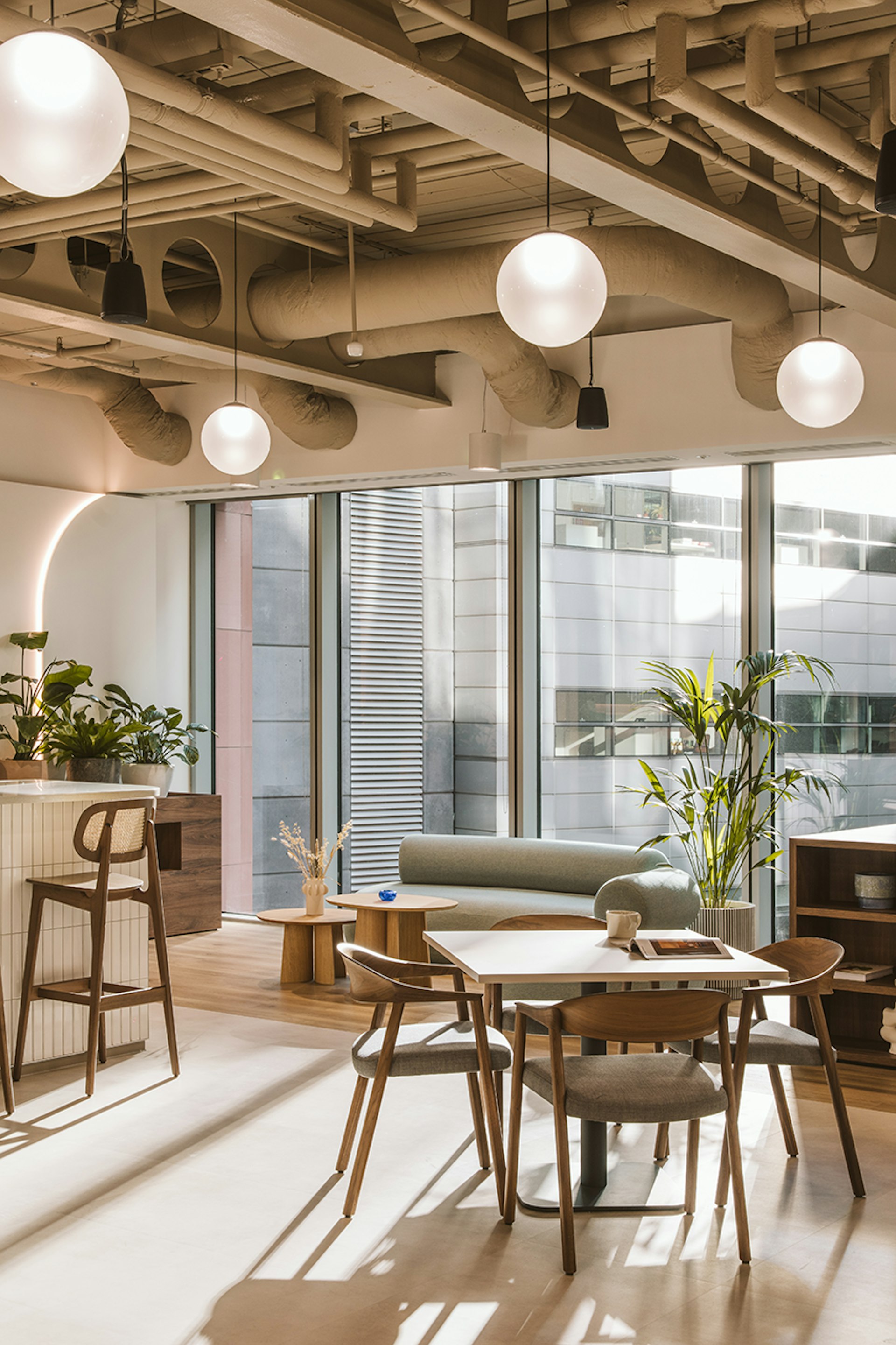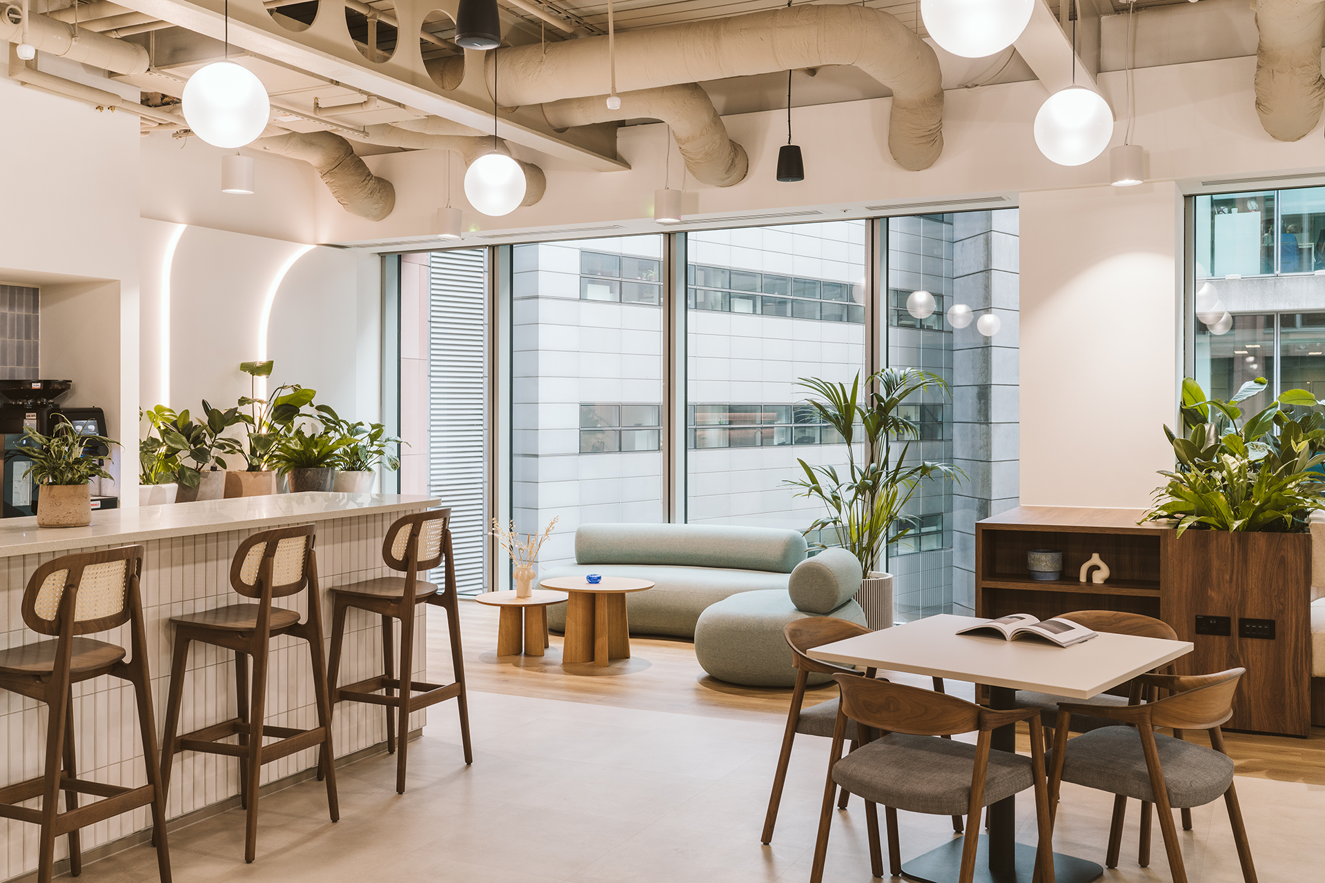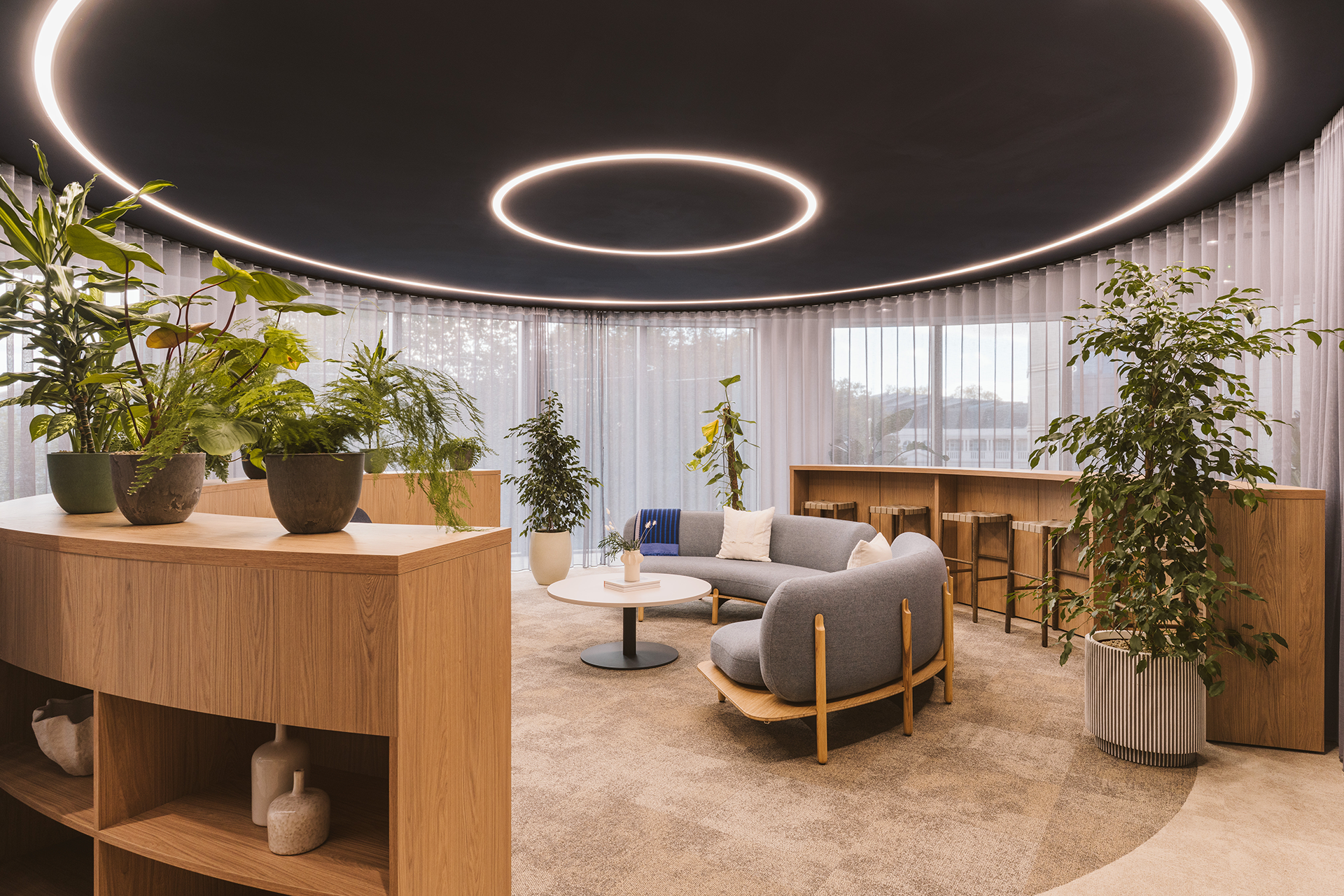 Whereas ‘The Spaceship’ facilitates spontaneous collaboration or team brainstorming, not only is this area placed amongst the main open plan area, to provide an easy flow of collaboration, but it is designed to look and feel like an ‘oasis’ amongst the desking. The circular shape of the space is mirrored through all aspects of this area, from the flooring to the curved furnishings, the sheer partition, and, of course, the bespoke light feature. These design aspects were chosen to amplify the area as a distinct collaboration space, and an alternative to a traditional desk. The large bay of windows provides great natural light to the area, and alongside the increased volume of planting in the area, fortifies the area as an ‘oasis’ for collaborative work.