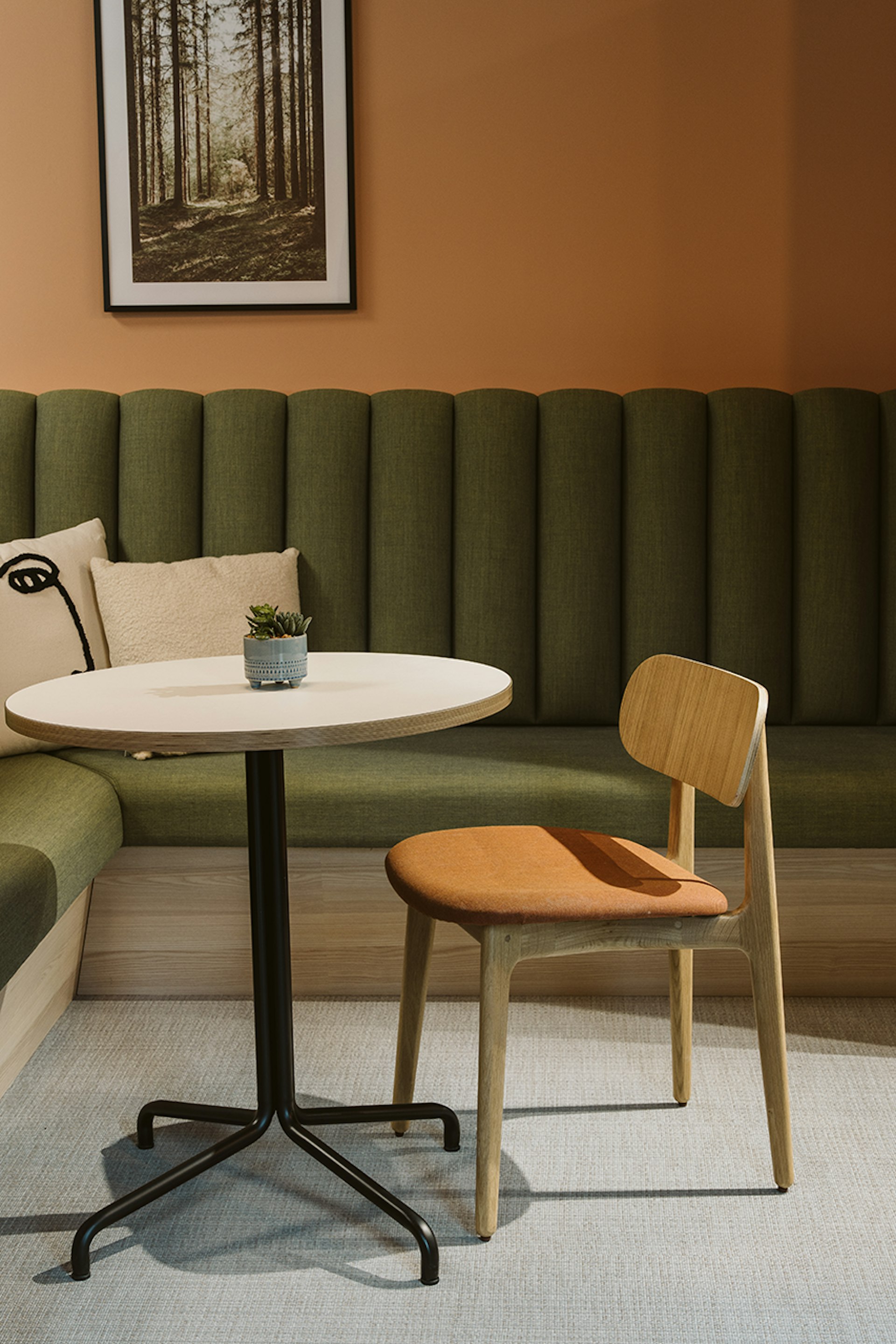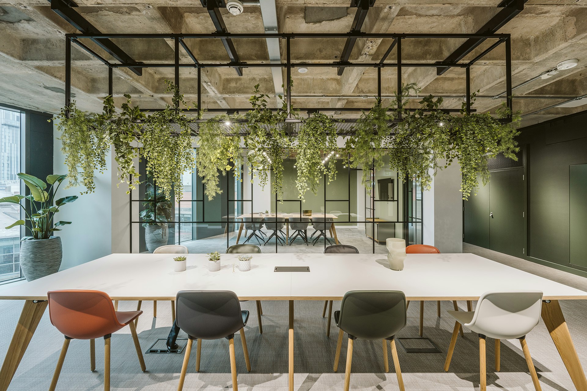 Peppered along the walls, you can find floor-to-ceiling panels of live moss. Handpicked from preserved forests, the moss improves acoustics, air quality, and wellbeing, while being self-maintaining through extracting the moisture out of the air and purifying it in return. Inspired by the amazing living wall in the reception area, the moss walls perfectly slot in between the feature paneled windows.