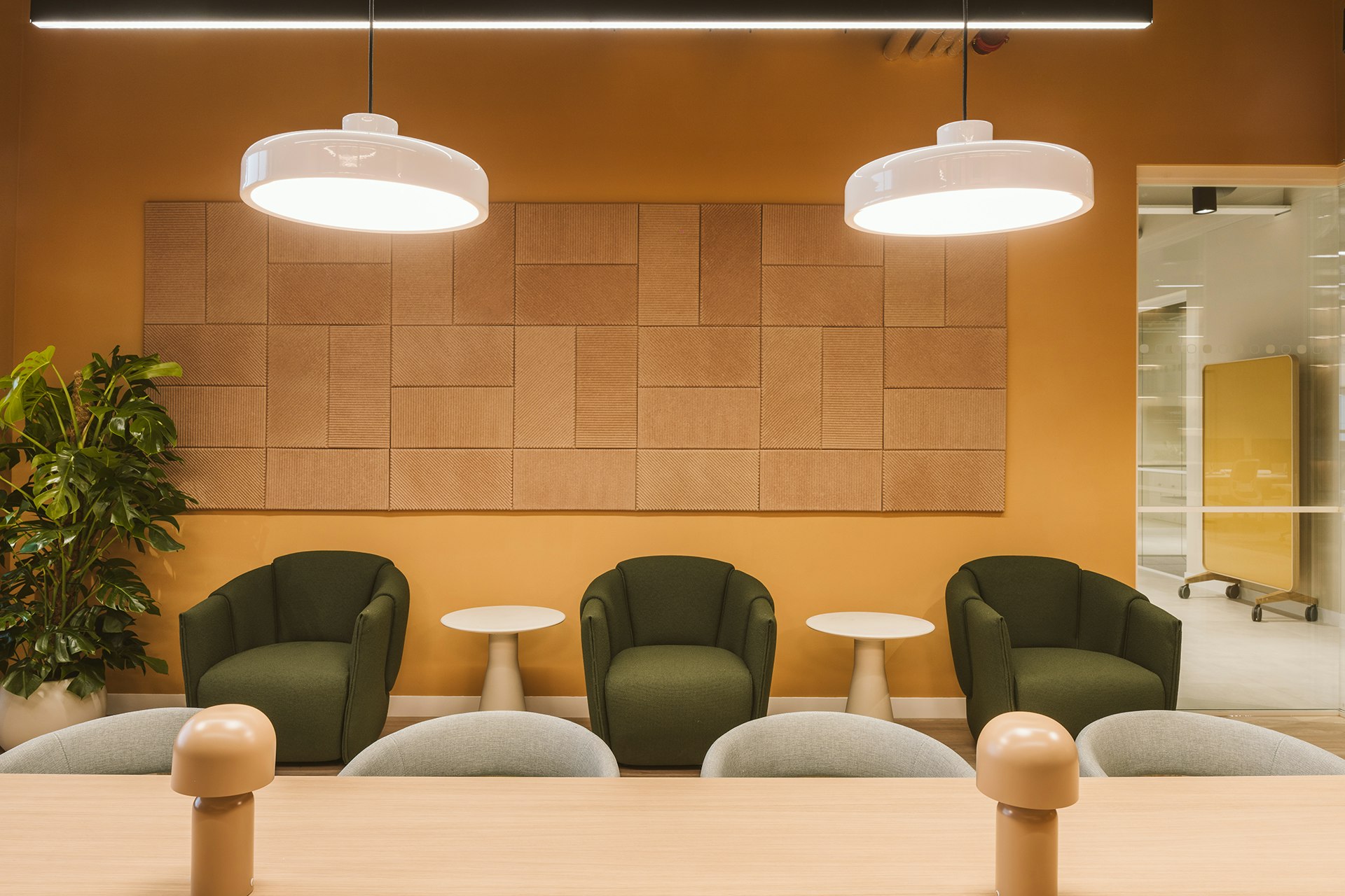 Intending to reflect the brand’s dynamic ethos throughout the space, we interpreted their brand colours with pops of yellow, terracotta, and green in the finishes and furnishings, adding a layer of energy to the space. This is offset with a neutral palette of light oak in both the flooring and joinery, ensuring the bright colours are not overwhelming.